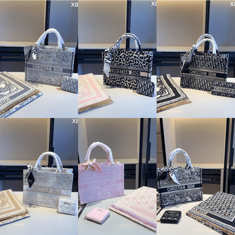 This Dior three-piece set features a shopping bag, scarf, and wallet, each adorned with the brand’s iconic “CHRISTIAN DIOR” branding and signature patterns. The shopping bag (36×28cm) offers spacious functionality, the scarf adds a touch of elegant styling, and the wallet (11×10cm) organizes essentials in style. Available in a range of eye-catching designs from classic monograms to bold prints, this set embodies Dior’s legacy of luxurious craftsmanship and versatile fashion. Perfect for those who appreciate a fusion of iconic branding, coordinated styling, and practical luxury, it makes a sophisticated statement suitable for elevating any ensemble, whether for daily use or special occasions.