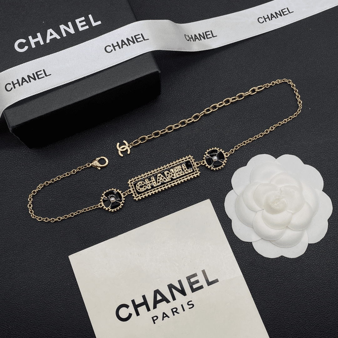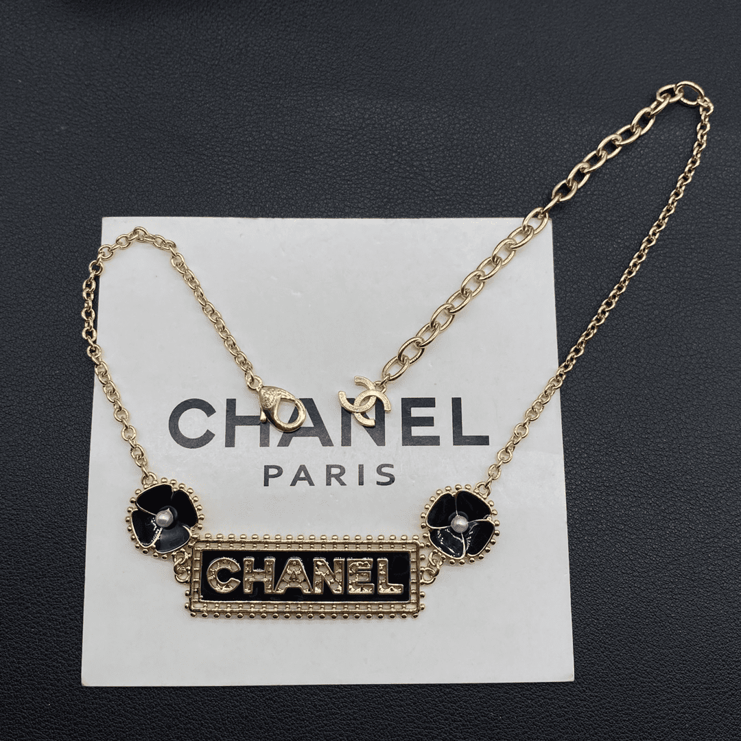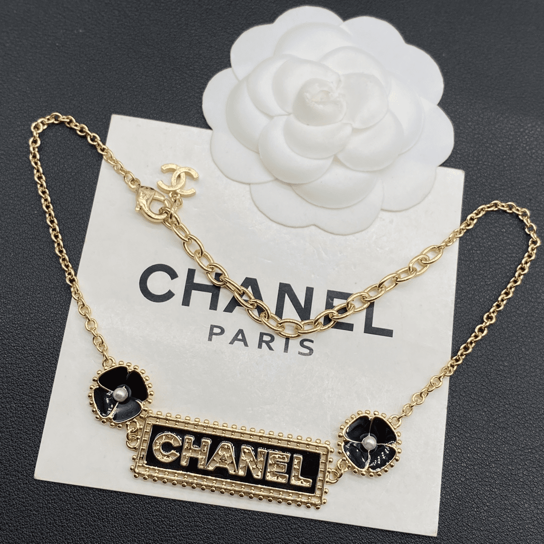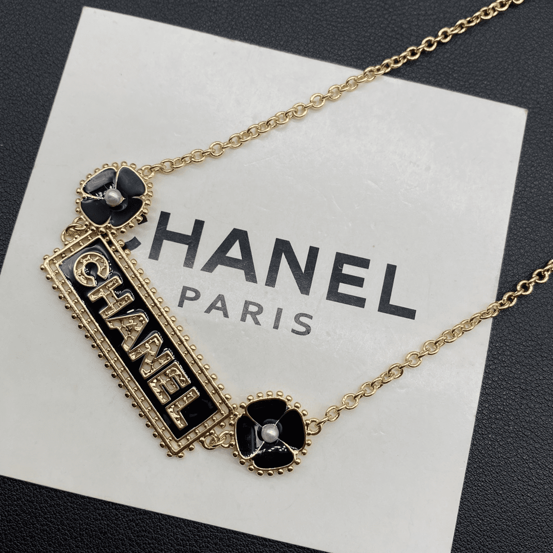 Home JEWELRY Chanel CHANEL necklace Fashionable and versatile temperament, black flower hollow letter long plate gold necklace