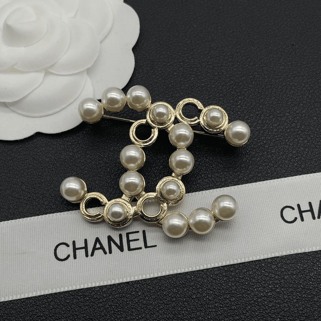 Home JEWELRY Chanel CHANEL brooch Fashionable and versatile temperament pearl inlaid gold double C hollow design brooch