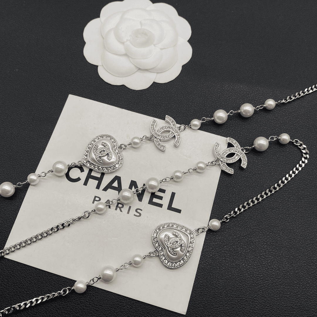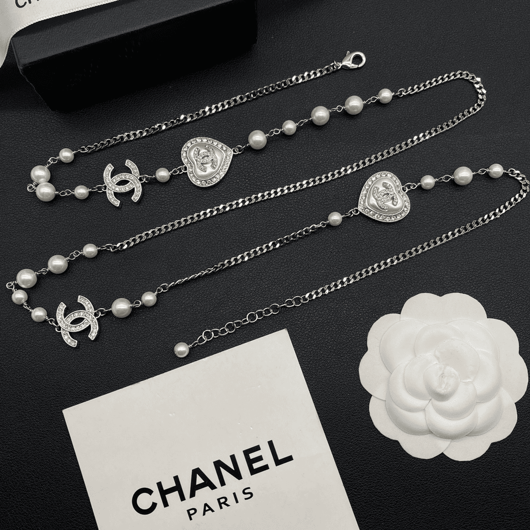 Home JEWELRY Chanel CHANEL necklace Fashionable and versatile temperament, white gold heart-shaped zircon inlaid pearl necklace
