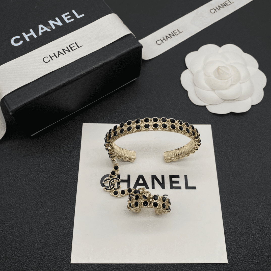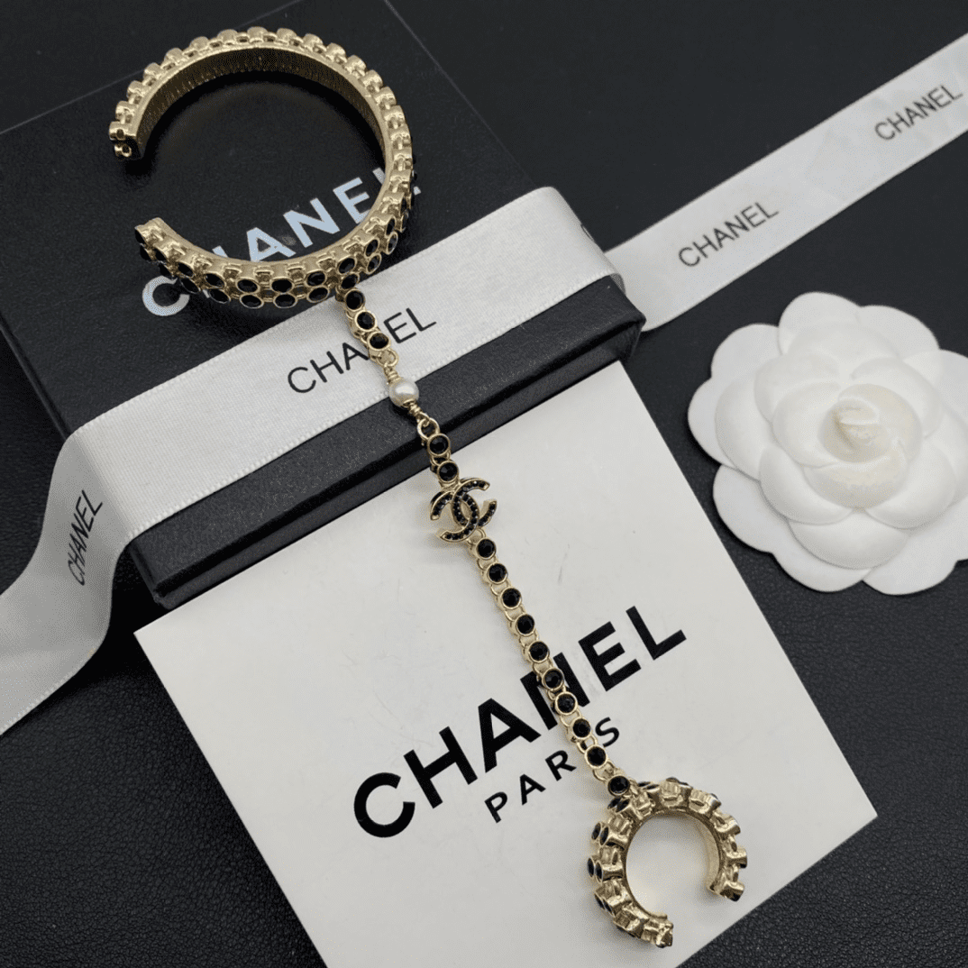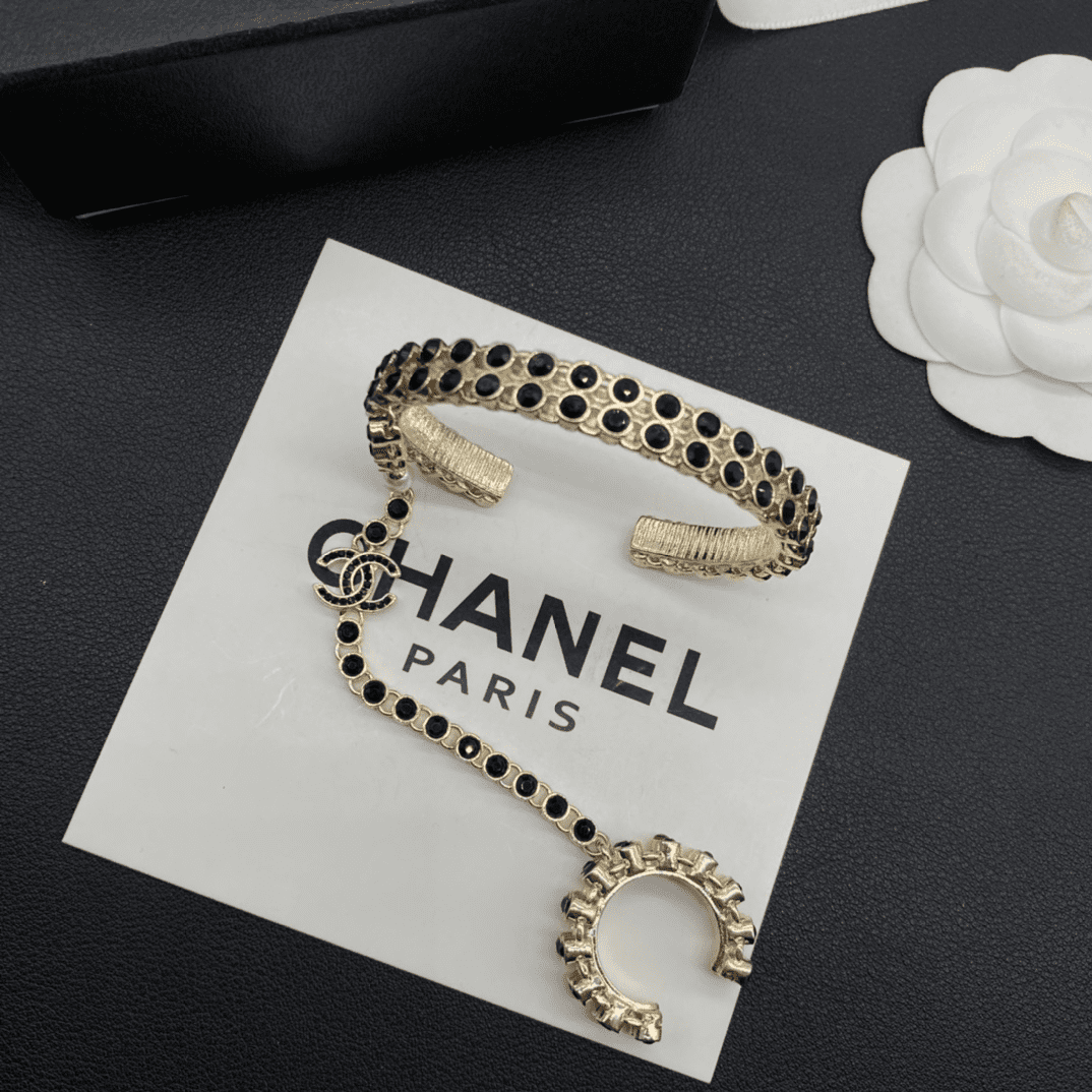 Home JEWELRY Chanel CHANEL Bracelet Fashionable niche black zircon inlaid open gold bracelet ring tassel chain integrated