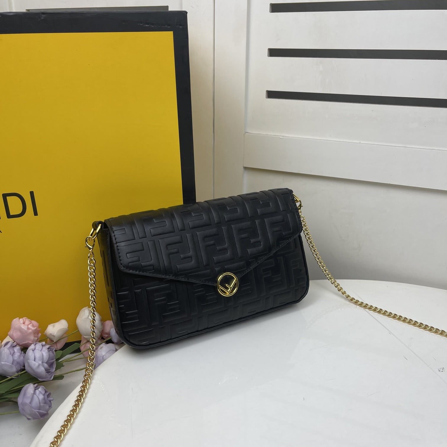 【FENDI】 Fendi’s latest geometric clamshell mini handbag with hardware accessories including the Fendi logo. Adopts the button opening and closing type, with two detachable inner bags – one with zipper, one with 8 card slots. Detachable chain strap. Lining with flat pockets. Black hand relief FF print. Gold metal pieces;