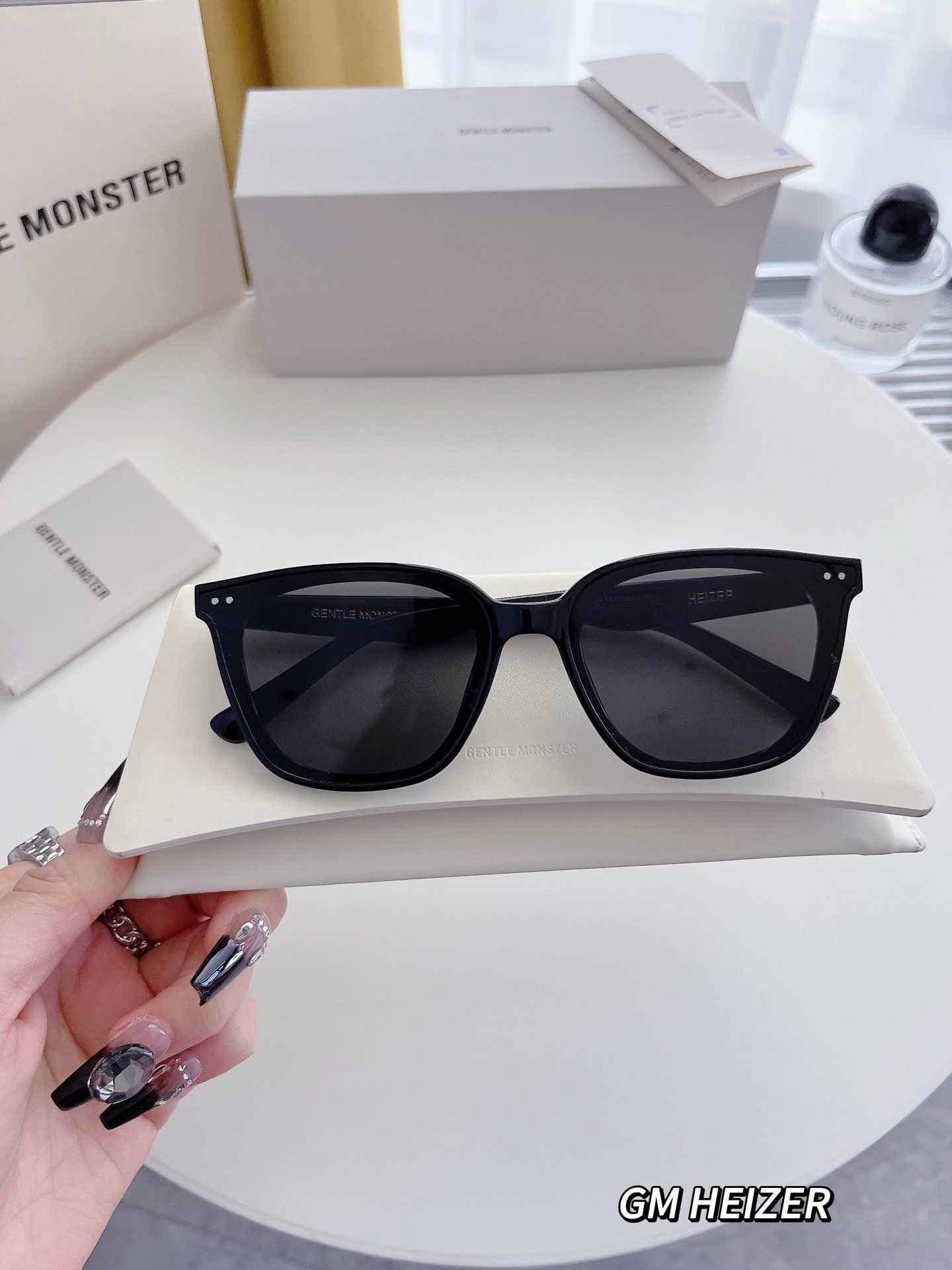 Elevate your look with Gentle Monster GM Heizer Sunglasses. These sunglasses feature sleek square frames in a classic black color, exuding contemporary cool and sophistication. The dark – tinted lenses not only provide excellent protection against the sun but also add an air of mystery to your style. Whether you’re heading out for a casual day or a fashionable event, they’re the perfect accessory. Paired with Gentle Monster’s elegant packaging, they’re a must – have for fashion – forward individuals.