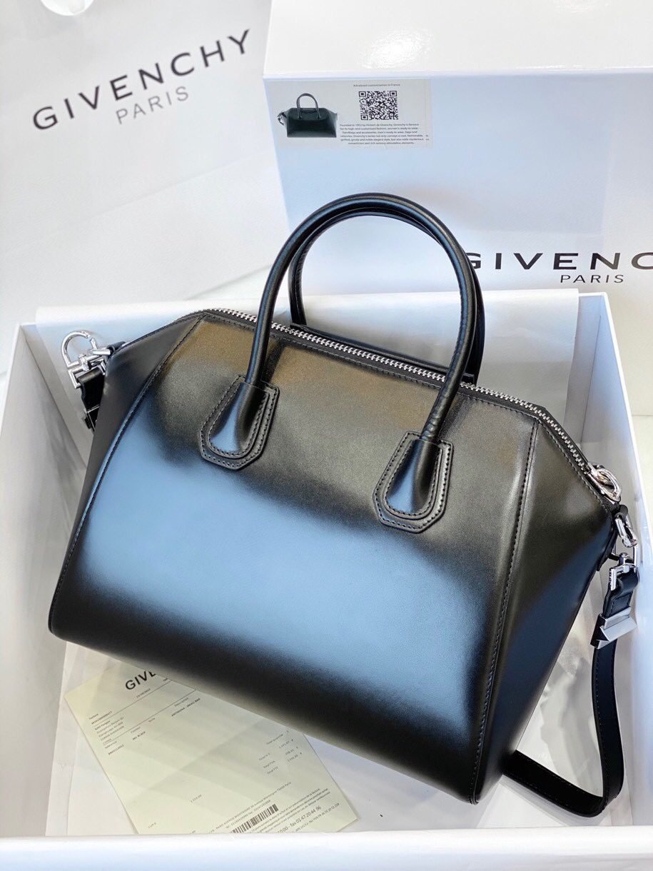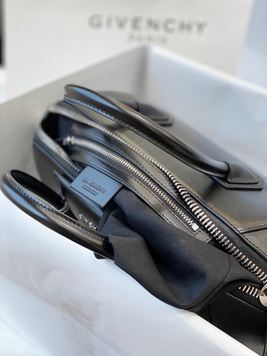 Top original single Givenchy antigona bare leather tote with top zipper with two handles on top front logo sticker removable shoulder strap Silver hardware accessory built-in zipper pocket.