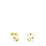 Tsuri Bear earrings in gold with gemstones set around the silhouette of the bear. Gemstones: garnet, amethyst and chrome diopside. Size of the gemstones: 1.5 mm. Size of the oval: 12 mm. Push back.