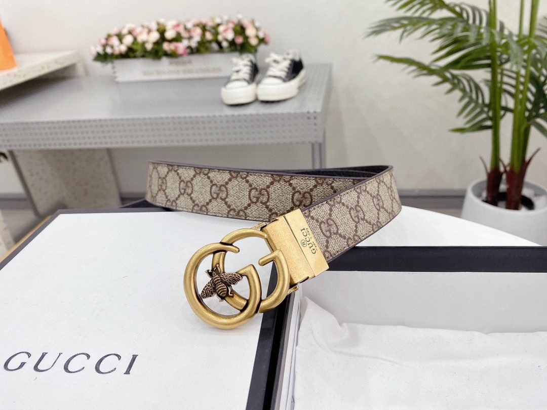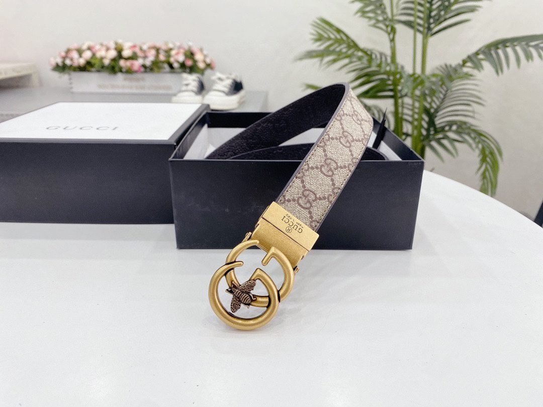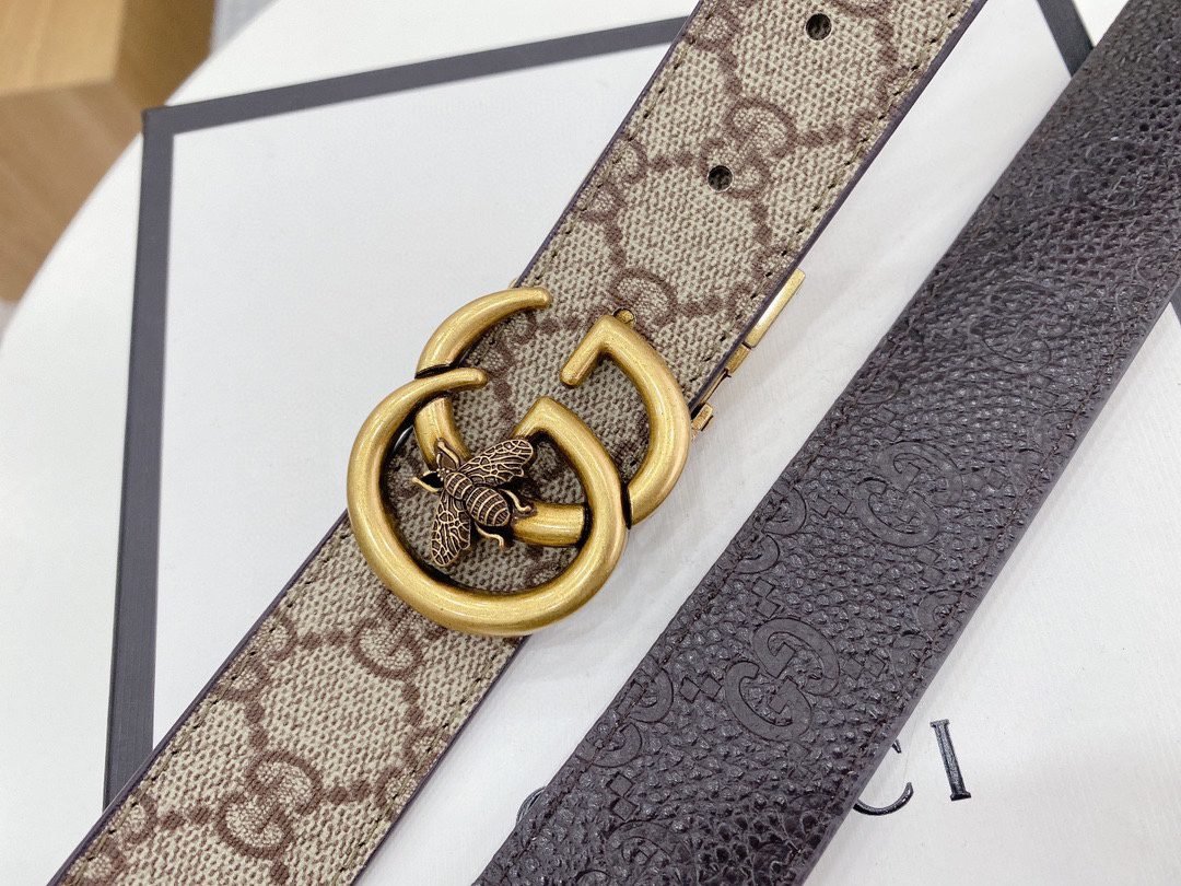 The Gucci bee double G buckle brown and beige intertwined belt demonstrates unparalleled luxury and taste with its unique design and exquisite craftsmanship. The belt is made of high-quality leather, with beige and brown intertwined, showing a low-key and elegant temperament. The bee embossed design on the buckle is exquisitely detailed and lifelike, which not only highlights the brand’s distinguished status, but also adds a sense of fashion and vitality. The belt can be used on both sides.