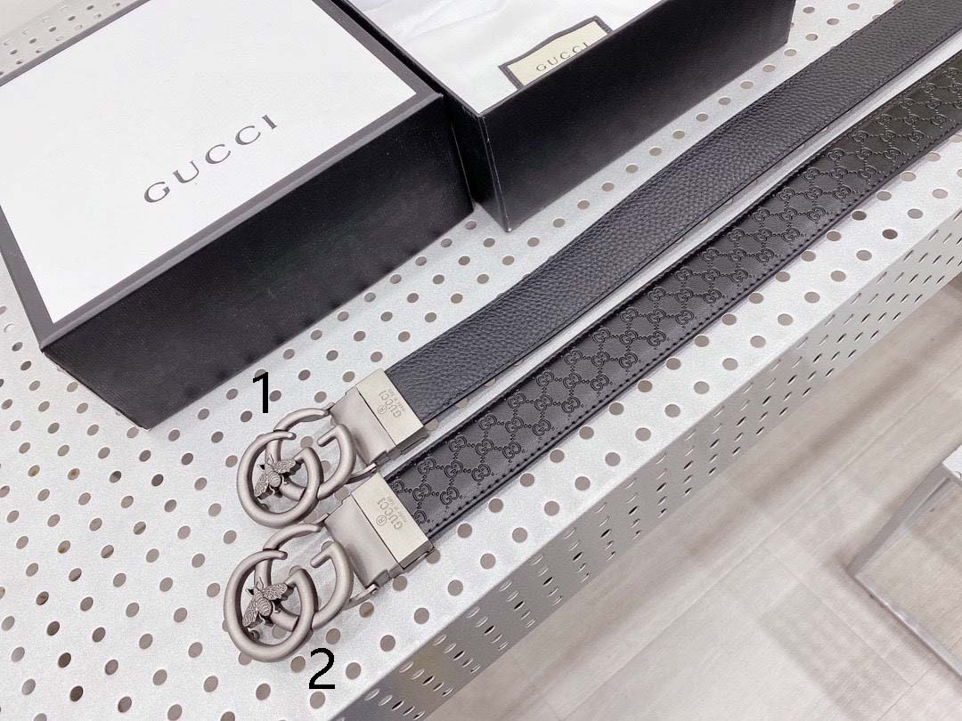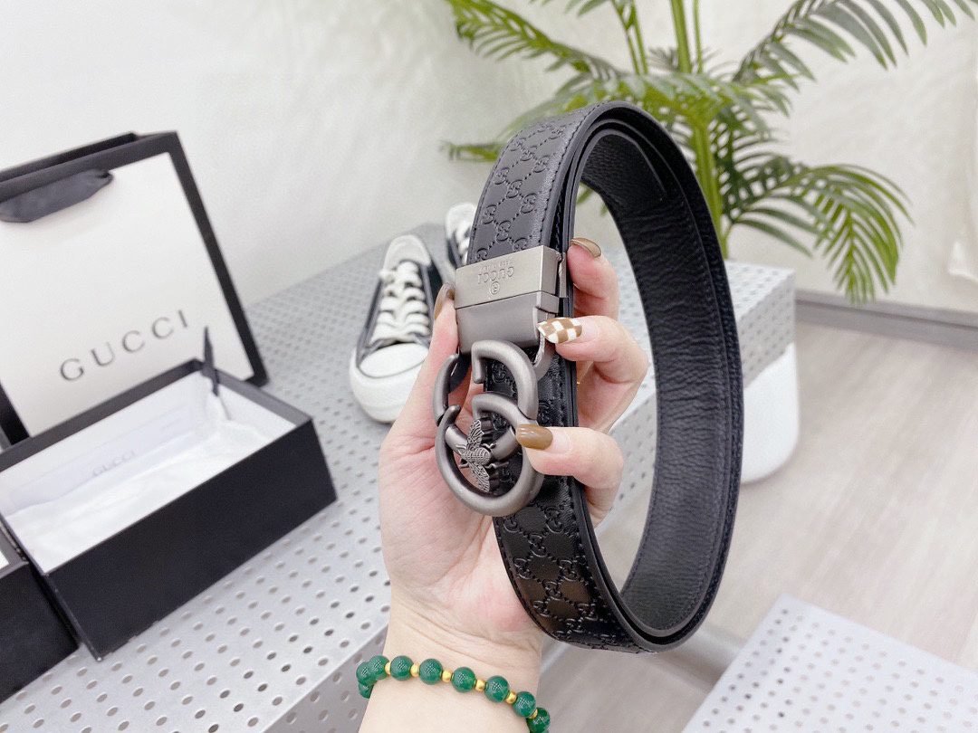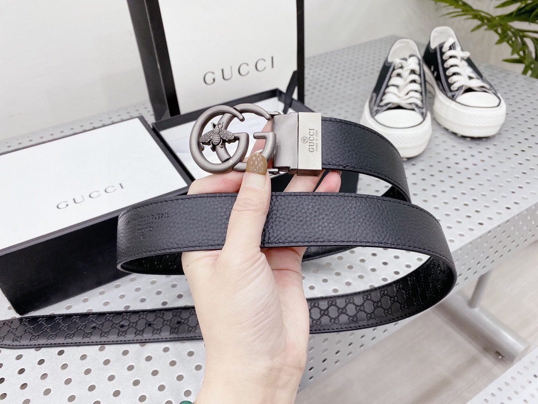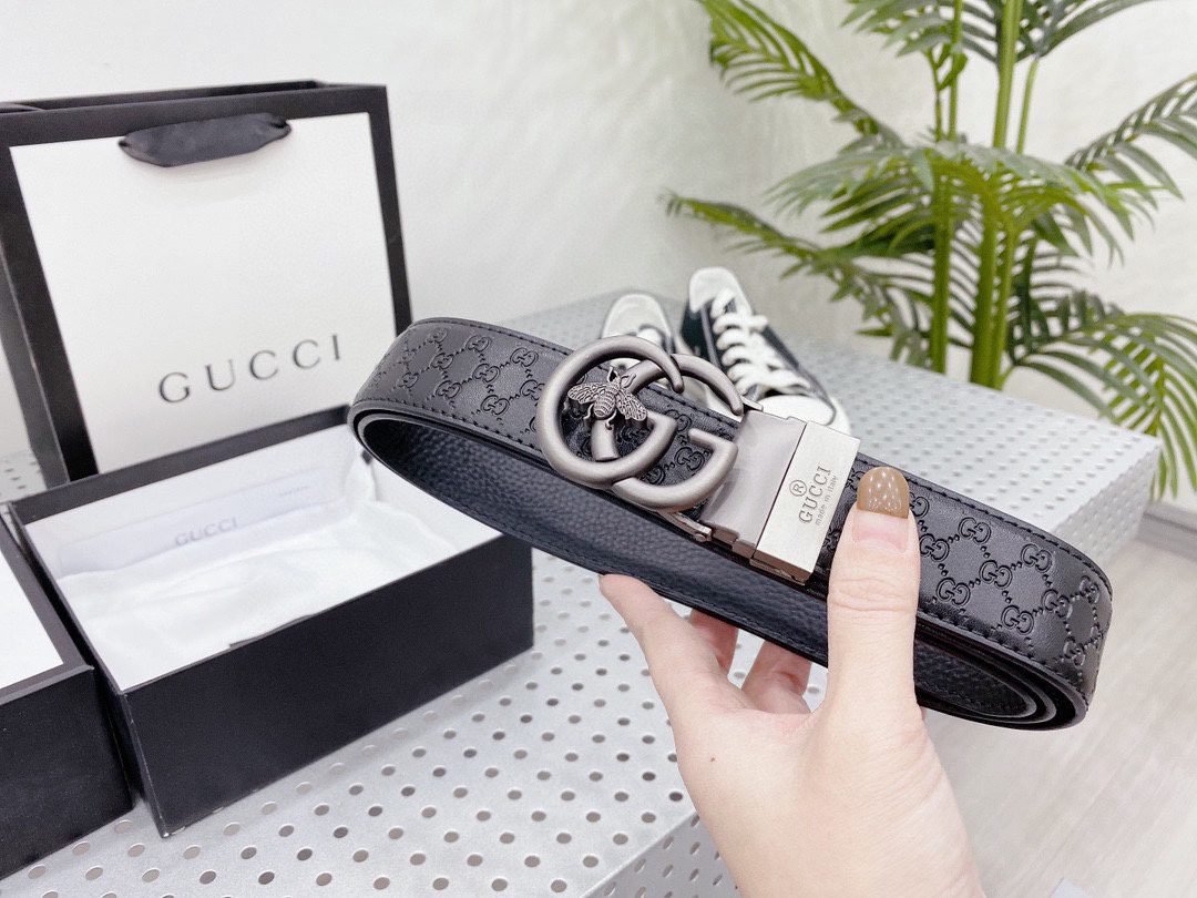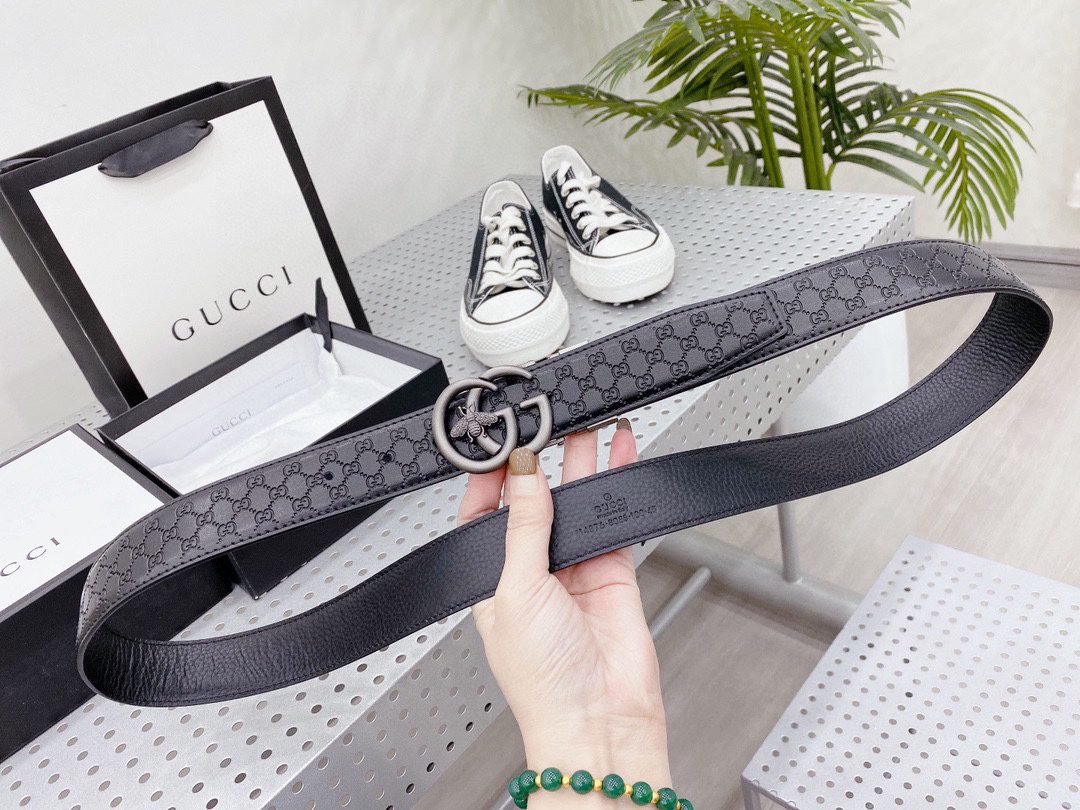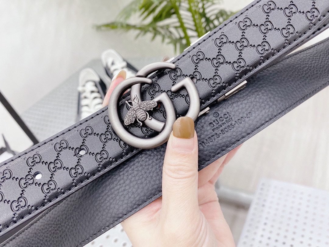 This Gucci Bee series black belt attracts countless eyes with its exquisite design and unique brand elements. The belt is made of high-quality black leather, which is delicate and wear-resistant, ensuring that it can maintain its new appearance after long-term use. The metal buckle on the belt is the highlight of this product. It is engraved with the letter “G” and a bee pattern, which not only shows the unique charm of the Gucci brand, but also highlights the personality and taste of the wearer.