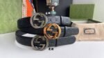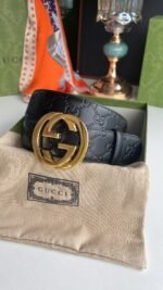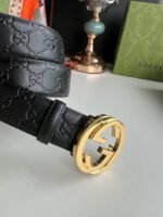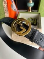 Gucci’s classic black gold belt has a simple yet elegant design style, perfectly integrating the brand’s luxury and fashion. The belt is made of high-quality leather, which is soft and delicate to the touch and has good durability. The metal buckle adopts a unique black and gold color scheme, showing its noble temperament, and the “Gucci” logo inlaid in the middle is a symbol of the brand.