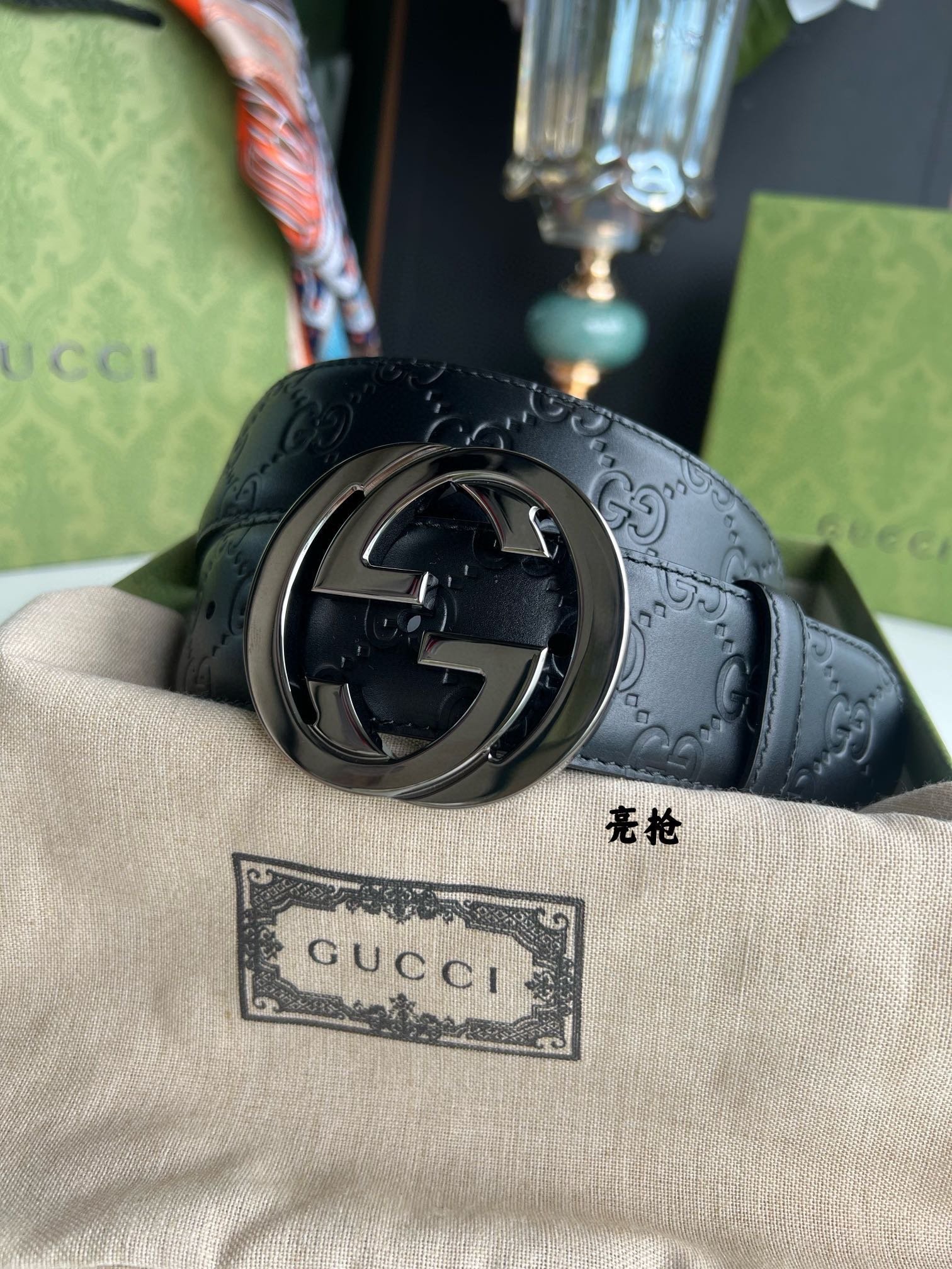 Gucci belt, shiny black gold belt, black gold buckle, thick to the touch, ultra-clear printed pattern