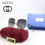 The lenses present a charming luster, adding a touch of mystery and charm to the wearer. The square frame has smooth lines, simple yet elegant, showcasing GUCCI’s consistent fashion taste. The metal decoration on the frame adds a touch of highlights to this sunglasses, making it stand out among many fashionable items. This pair of sunglasses is carefully placed on a red velvet cushion, which is soft and comfortable, protecting the glasses from damage and making them suitable for various occasions, whether for leisure vacation or business travel, showcasing your unique taste.