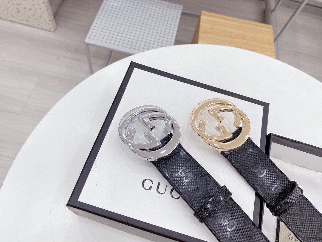 Gucci black belt with silver metal buckle, simple and elegant, refined and luxurious