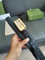 This Gucci black crocodile leather gold buckle luxury belt demonstrates the fashion charm of the Gucci brand with its excellent quality and unique design. The belt is made of top-grade crocodile leather, which is soft and elastic to the touch, while showing a natural luster and delicate texture. The gold buckle design is simple and luxurious, complementing the black crocodile leather, highlighting the wearer’s distinguished status and taste.