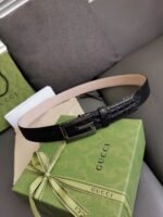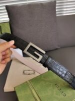 This Gucci black crocodile pattern silver buckle belt has become the focus of the fashion world with its extraordinary texture and unique design. The top-quality leather material is selected to give the belt a delicate texture and unique luster, showing an unparalleled sense of luxury. The silver square buckle is inlaid with the classic “GUCCI” logo, which is simple yet grand, highlighting the brand’s unique charm.