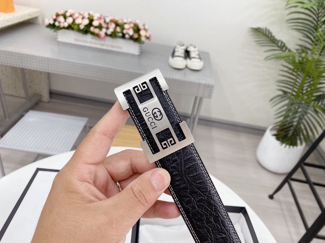 Gucci black wide belt with silver buckle, clear leather texture, delicate touch and strong gloss