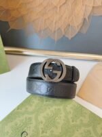 GUCCI bright gun color double G buckle black textured belt, with black as the main color, showing low-key luxury. The exquisite G-shaped buckle design is made of high-quality metal and has a dazzling luster, showing the unique charm of the brand. The belt is made of high-quality leather, which is soft and delicate to the touch, wear-resistant and durable, giving you a long-lasting use experience.