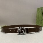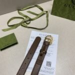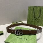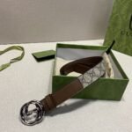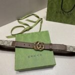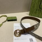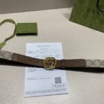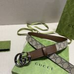 This Gucci brown and beige classic double G buckle belt is a perfect combination of fashion and taste. The belt is mainly in elegant tan and beige colors, highlighting the classic charm of the brand. The double G buckle design in the middle is a signature element of the Gucci brand, which not only highlights the brand’s unique identity but also adds a sense of fashion. The high-quality leather material makes the belt soft and comfortable to the touch, and also has excellent durability.
