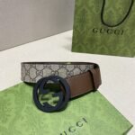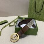 This Gucci brown and beige classic leather belt, with its unique two-color design and exquisite craftsmanship, shows the classic charm of the Gucci brand. The belt is made of high-quality leather material, soft to the touch and durable. The exquisite “GUCCI” engraved on it highlights the brand’s nobility and luxury. At the same time, the belt is paired with a green Gucci shopping bag, and the overall shape is elegant and generous, which is unforgettable at first sight.