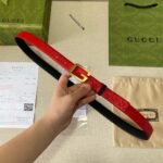 This Gucci classic black and red textured leather belt shows the wearer’s extraordinary taste with its unique charm. The belt is made of top-grade textured leather, which is soft and delicate to the touch, and has good wear resistance and durability. Red is a classic among classics. It is not only fashionable and eye-catching, but also highlights the wearer’s personality and vitality. The belt buckle is made of metal with the word “GUCCI” engraved on it, which reveals a luxurious atmosphere in a low-key manner.
