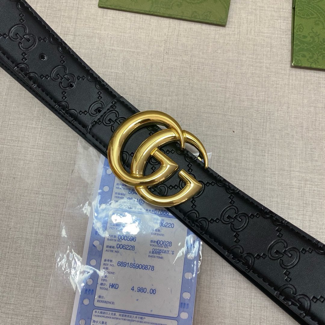 This Gucci elegant black classic double G buckle belt interprets the luxury and classics of the Gucci brand with its exquisite craftsmanship and unique design. The belt is made of high-quality leather material, which is soft to the touch and wear-resistant, and will retain its luster as new after long-term use. Classic black tone with golden double G buckle, simple yet fashionable, showing the wearer’s taste and personality