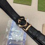 This Gucci classic black G-pattern gold buckle belt combines the brand’s classic elements with modern design, highlighting the wearer’s extraordinary taste and personality. The belt is made of high-quality black leather, with the classic “G” letter pattern printed on the surface, revealing a sense of luxury in a low-key manner. The golden buckle has a unique design, and the capital “G” in the middle complements the golden frame, adding a fashionable touch to the belt.