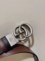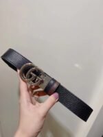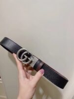 This Gucci classic black leather men’s belt has become a classic in the fashion industry with its exquisite design and excellent quality. The belt is made of high-quality leather, which is soft and comfortable to the touch, and has excellent durability and wear resistance. The silver buckle and metal lock are engraved with the classic “GUCCI” word, which is simple yet luxurious, highlighting the wearer’s unique taste and noble status.
