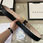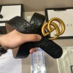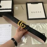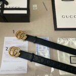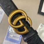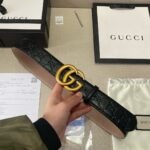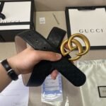Gucci’s classic double G black textured belt combines the brand’s classic elements with modern design. It is made of premium leather, carefully polished and processed, with clear texture, showing a delicate and durable texture. The double G logo on the belt is presented with exquisite embossing technology, shining with a unique luster, highlighting the brand’s nobility and elegance. The entire belt design is simple yet elegant, perfectly interpreting the classic style of Gucci.