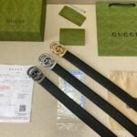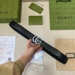 This GUCCI classic black belt with double G logo has become a favorite in the fashion world for its unique design and exquisite craftsmanship. The belt uses black as the main color, with a silver double G logo buckle, highlighting the wearer’s noble temperament and unique taste. Whether it is a business occasion or leisure time, this belt can be your right-hand man, adding a touch of color to your outfit.