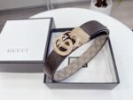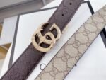 Gucci’s classic double G men’s brown belt combines the brand’s classic elements with modern design. Selected high-quality brown leather, with a fine and smooth surface, soft and comfortable feel, and wear-resistant and durable. The unique double G logo buckle is designed in gold, which is exquisite and elegant, showing the charm of the brand. The small particle design on the edge of the belt not only improves the visual effect, but also increases friction to ensure stability when worn.