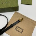 This GUCCI classic gold G buckle black belt shows extraordinary luxury and taste with its unique gold G letter buckle and elegant black leather design. The belt is made of fine leather, which is soft and comfortable to the touch, wear-resistant and shiny. The golden G fastener is exquisite and shining, highlighting the brand’s classic and fashionable atmosphere.