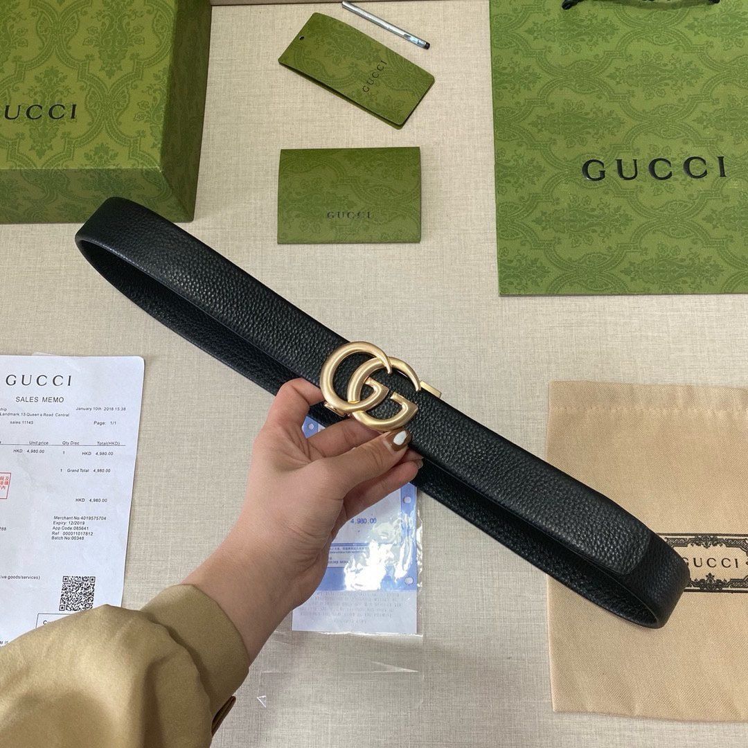 This GUCCI classic black belt with double G logo has become a favorite in the fashion world for its unique design and exquisite craftsmanship. The belt uses black as the main color, with a gold double G logo buckle, highlighting the wearer’s noble temperament and unique taste. Whether it is a business occasion or leisure time, this belt can be your right-hand man, adding a touch of color to your outfit.