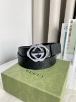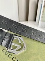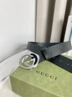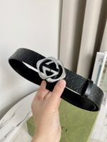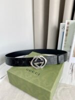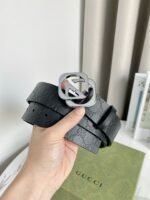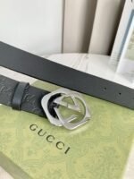 Gucci’s classic black belt combines traditional craftsmanship with modern design, highlighting the brand’s unique charm. The belt is made of high-quality leather material, which is soft and elastic to the touch, ensuring comfort and durability for long-term use. The exquisite silver buckle is inlaid with the classic Gucci double G logo, which is simple yet elegant, showing the wearer’s taste and style.