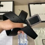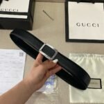 2.Unique design: The belt buckle is decorated with a metal square with the word “GUCCI” engraved on it, which not only shows the brand’s identity but also adds a sense of fashion.