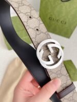 2.Unique design: The belt is in classic tan color, showing a sense of low-key luxury. The metal buckle is printed with GUCCI’s classic double G logo, highlighting the brand’s charm.