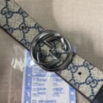 This Gucci dark blue and beige belt, with its unique design and exquisite craftsmanship, shows the unique charm of the Gucci brand. The belt adopts a dark blue and beige design, showing a low-key luxury. The “GUCCI” brand logo and pattern are printed on the belt to highlight the brand identity. The silver buckle design is simple and elegant, which complements the overall style of the belt.