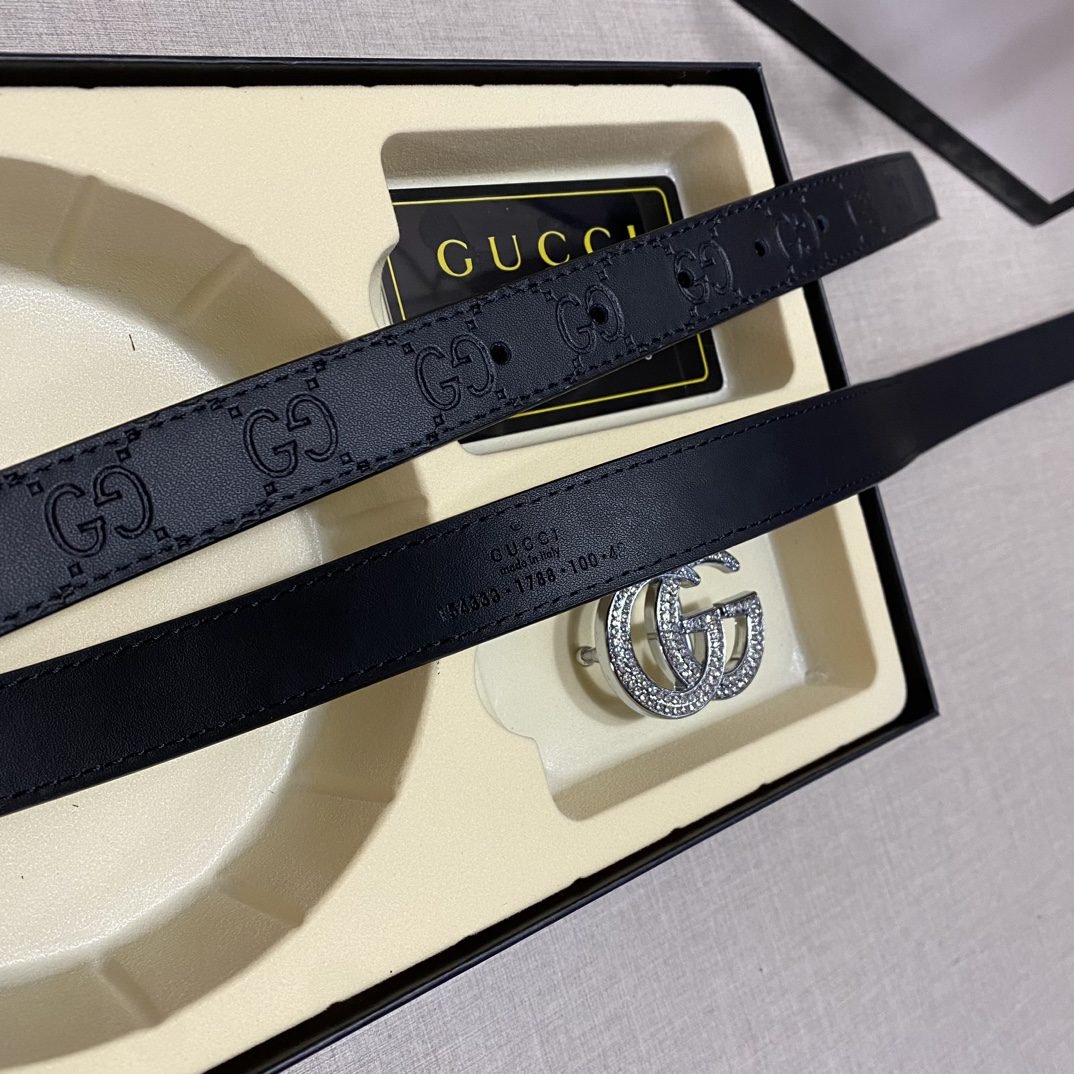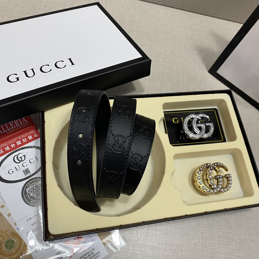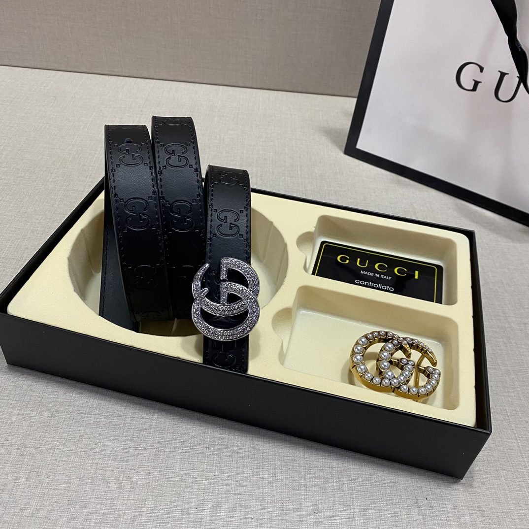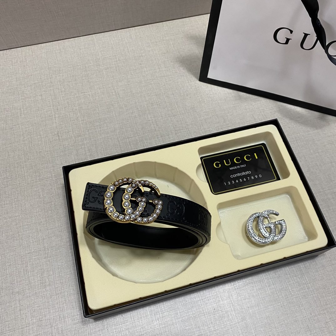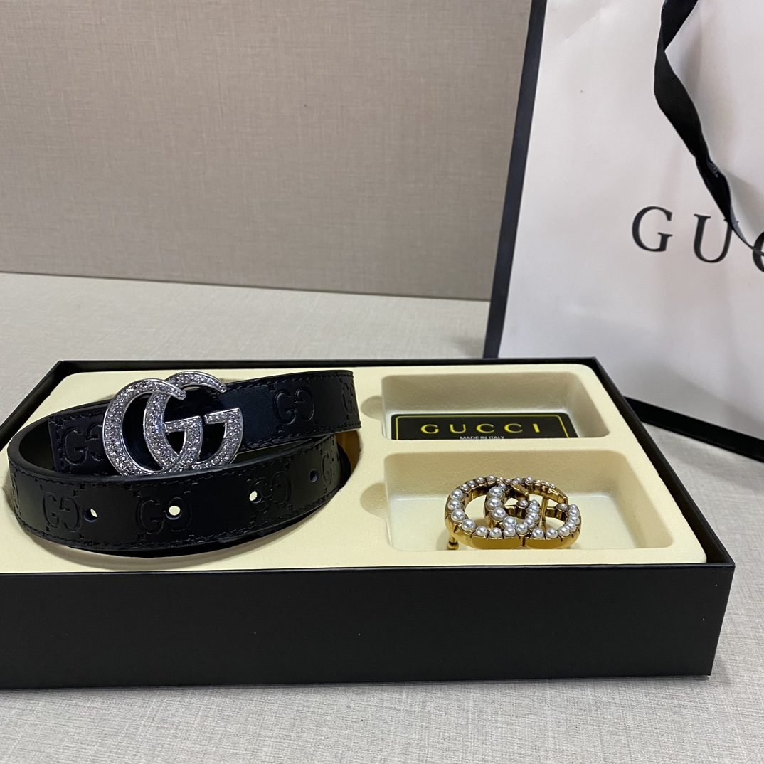 Gucci double buckle gift box set belt perfectly combines elegance and fashion. Made of high-quality black leather, it is soft and wear-resistant, with a full gloss and extraordinary texture. The belt buckle adopts the classic double G design. In addition, the gift box is equipped with two different buckles to meet your dressing needs for different occasions. The overall design is exquisite and sophisticated, showing the wearer’s dignity and taste.