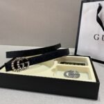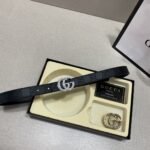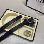 Gucci double buckle gift box set belt perfectly combines elegance and fashion. Made of high-quality black leather, it is soft and wear-resistant, with a full gloss and extraordinary texture. The belt buckle adopts the classic double G design. In addition, the gift box is equipped with two different buckles to meet your dressing needs for different occasions. The overall design is exquisite and sophisticated, showing the wearer’s dignity and taste.