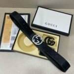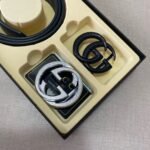 The Gucci double-buckle belt gift box set is a perfect blend of elegance and luxury. The belt in the gift box is made of top-grade black leather, which is soft and delicate to the touch, and has a natural and lasting luster. The belt buckle is designed in silver and black, with a striking double G logo in the center, highlighting the unique charm of the Gucci brand. In addition, the gift box is also equipped with two buckles of different sizes to meet your dressing needs for different occasions. The overall design is exquisite and sophisticated, showing the wearer’s dignity and taste.