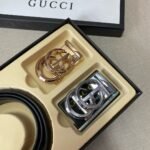 The Gucci Double G Buckle Belt Gift Box Set combines the brand’s classic elements with modern fashion. Made of top-grade black leather, the belt has a very high gloss surface and feels soft and delicate, showing an unparalleled texture. The Double G buckle is exquisitely designed and made of metal, which is shiny and forms a sharp contrast with the black belt, showing a luxurious taste. In addition, the gift box is equipped with two different buckles, and every detail has been carefully polished, showing the ingenuity of the Gucci brand.