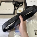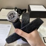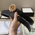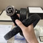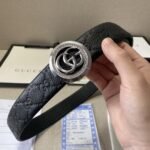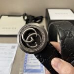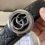 This Gucci classic double G buckle black belt, with its unique design and exquisite craftsmanship, highlights the extraordinary charm of the brand. The belt is made of high-quality leather, soft and delicate to the touch, deep and elegant in color. The buckle is decorated with round elements similar to gemstones, shining with charming light, forming a sharp contrast with the black belt, showing both luxury and fashion.