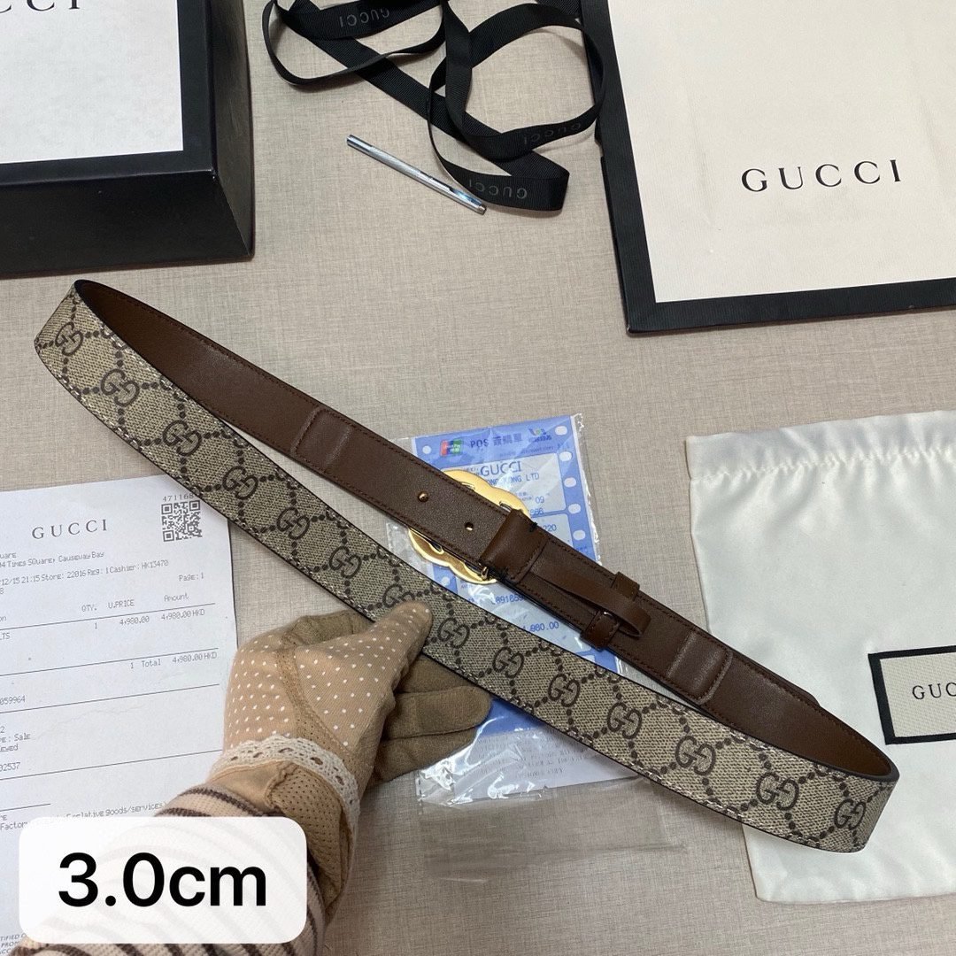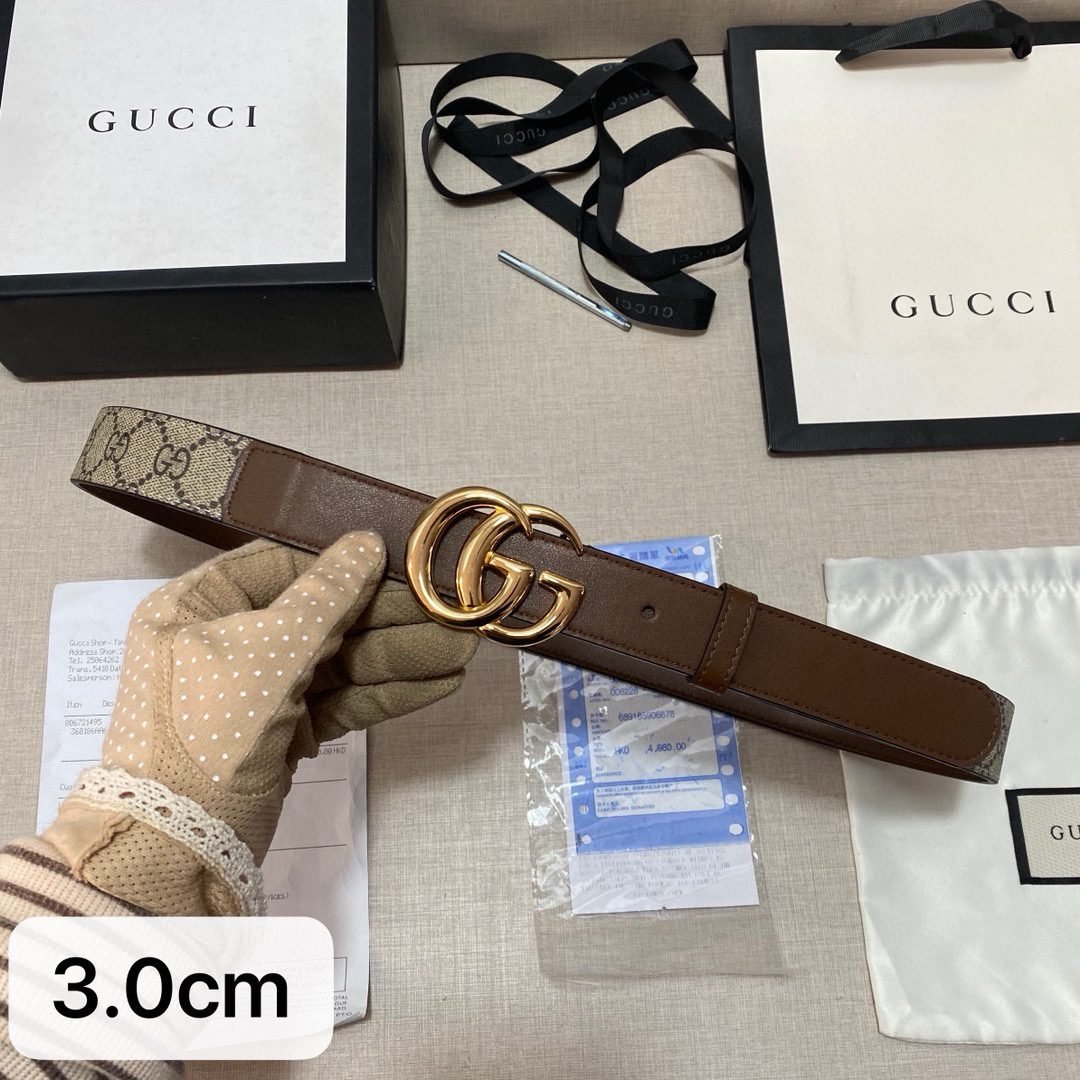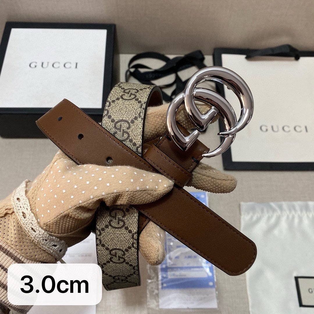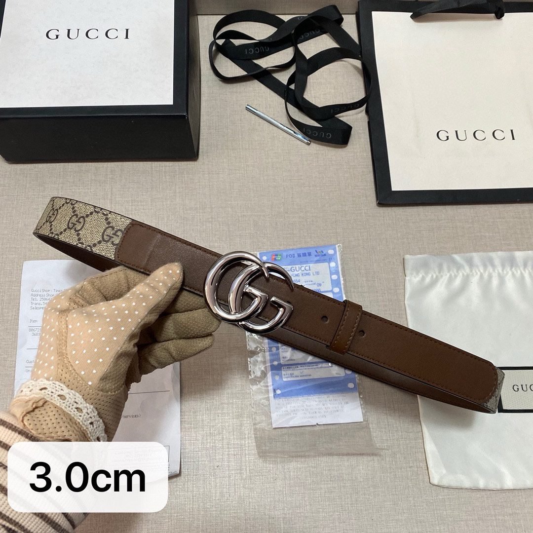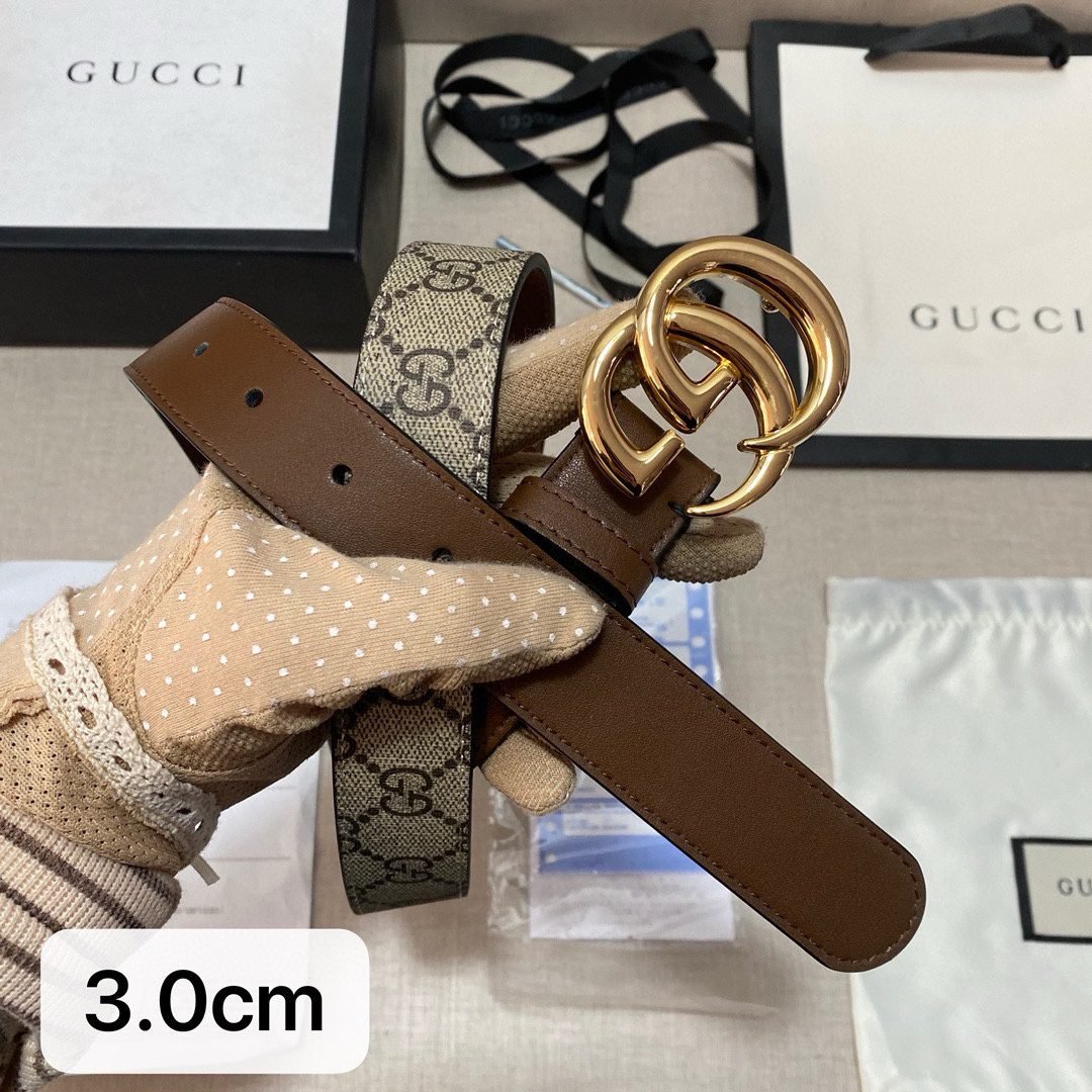 The Gucci double G buckle brown and beige intertwined belt is based on selected brown leather, showing unique elegance and luxury. The surface of the belt has been finely polished, with a delicate touch and a warm color, showing an unparalleled texture. As the iconic design of the Gucci brand, the double G buckle shines brightly, showing nobility and extraordinary. The entire belt design is simple and classic.