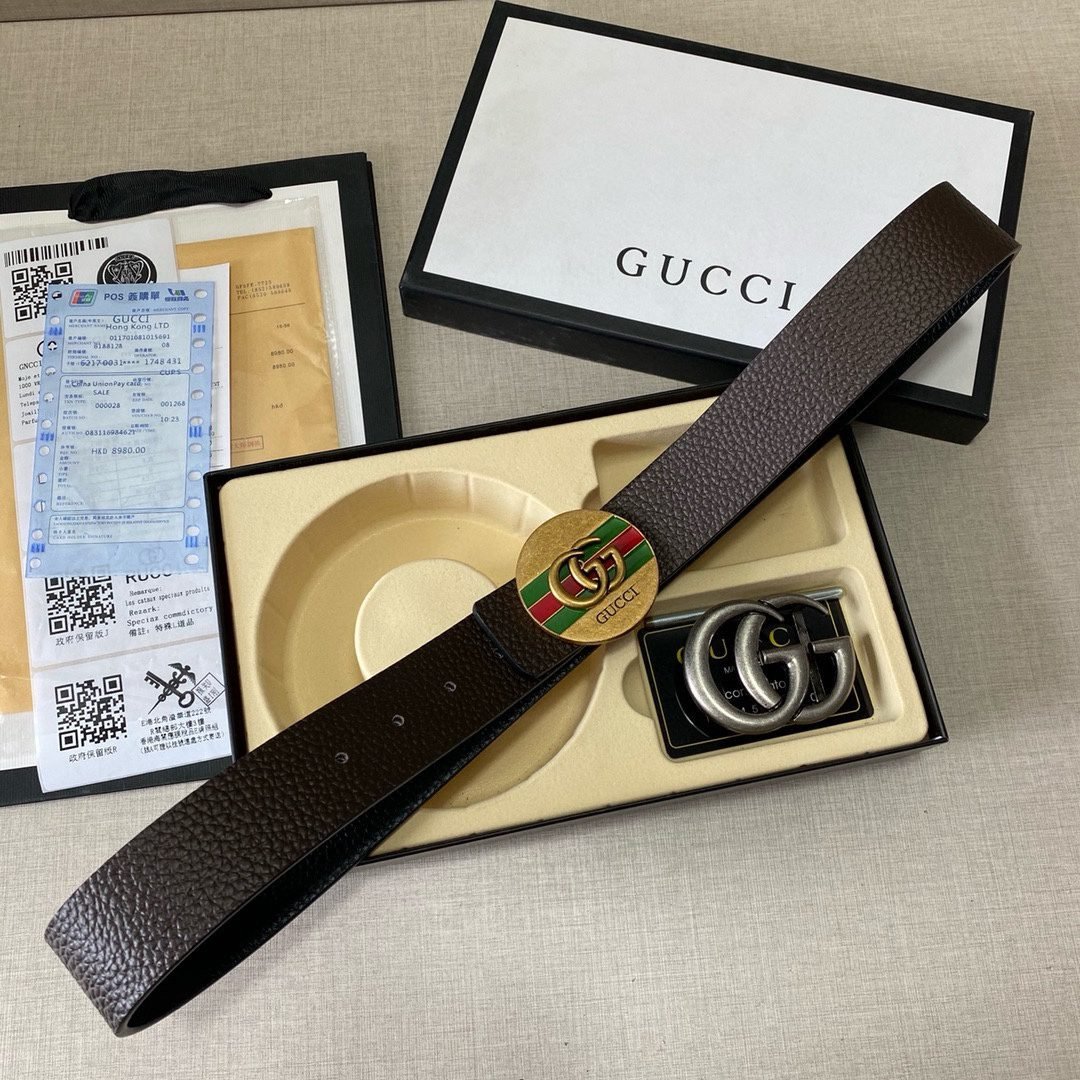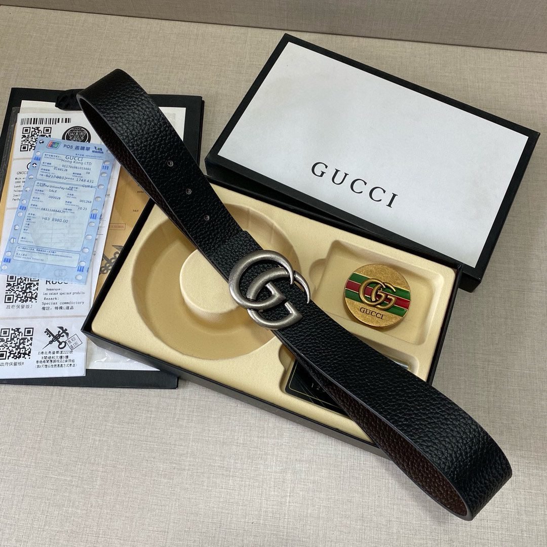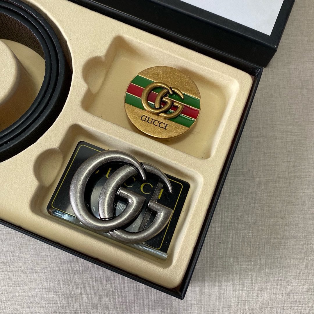 This Gucci double G buckle gift box set, with its unique design and exquisite craftsmanship, demonstrates the brand’s unparalleled fashion taste and craftsmanship. The black leather belt is classic and timeless, showing a low-key sense of luxury. In addition, the gift box is equipped with two buckles. The green and red stripes on the gold buckle inject a touch of vitality, and the silver double G buckle makes the overall design more fashionable and dynamic. The belt is made of high-quality leather material, which is soft and delicate to the touch and durable, ensuring your comfortable experience of wearing it for a long time.