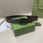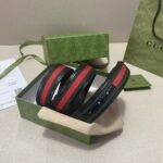 This Gucci fashionable three-color striped black buckle belt has become the focus of the fashion world with its unique three-color striped design. The classic combination of red, green and black not only highlights the brand’s vitality and passion, but also reveals a low-key luxury. The belt is made of high-quality leather, which is soft and comfortable to the touch, wear-resistant and durable. The black double G buckle serves as the brand’s logo, highlighting the wearer’s taste and identity.