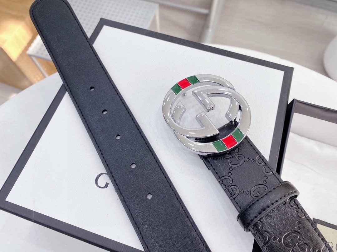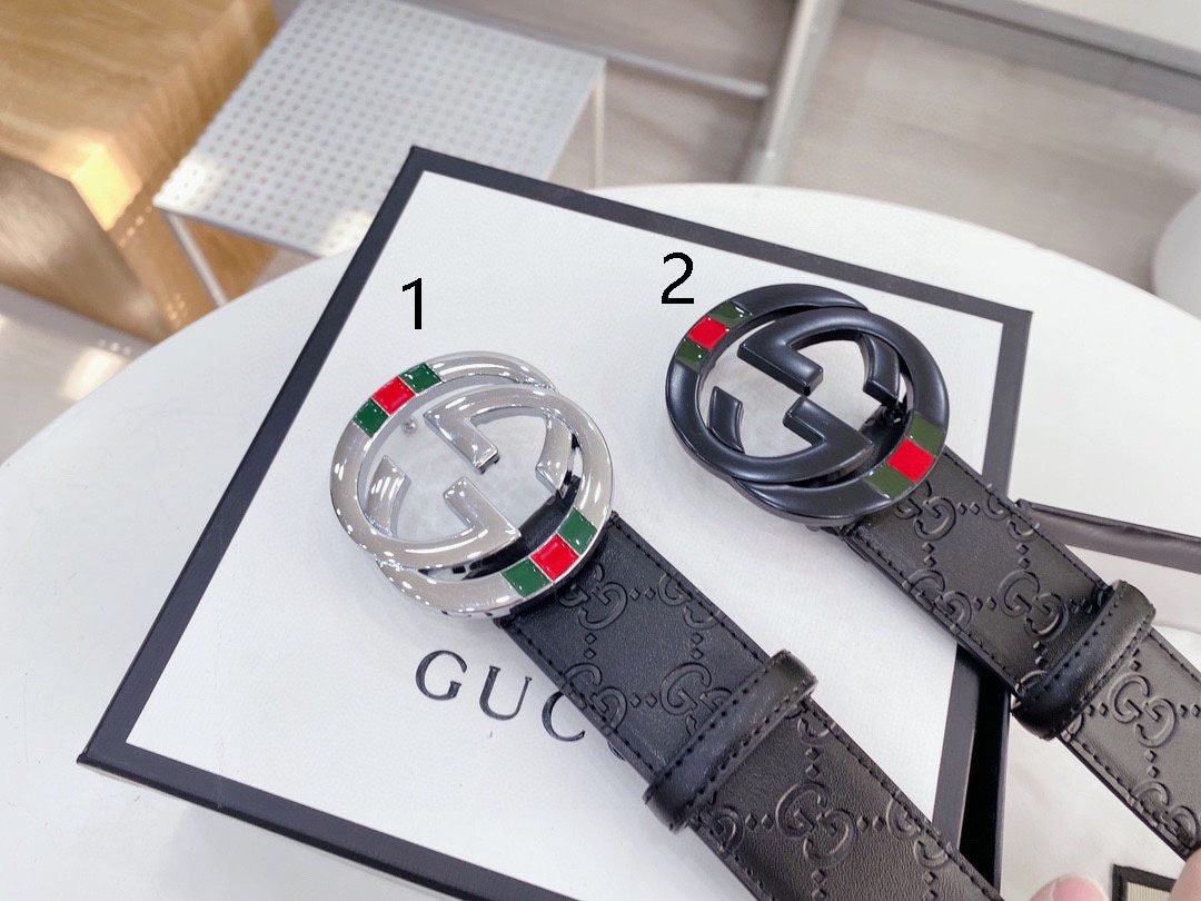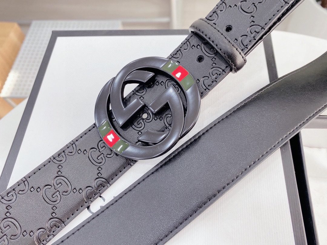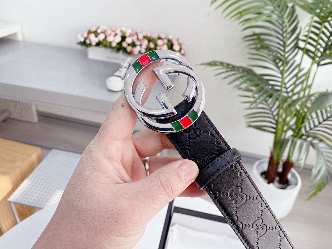GUCCI G-shaped classic two-color edge belt perfectly combines the brand’s classic elements with modern design. The belt is made of top-grade leather material, which is soft and delicate to the touch, highlighting quality and nobility. The eye-catching “G” logo on the belt buckle is made with exquisite craftsmanship, highlighting the brand’s charm. In particular, the middle of the buckle is inlaid with red and green two-color trim, which adds a touch of fashion and vitality to the overall design, allowing you to become the focus of any occasion.