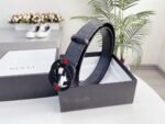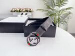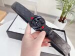 GUCCI G-shaped classic two-color edge belt perfectly combines the brand’s classic elements with modern design. The belt is made of top-grade leather material, which is soft and delicate to the touch, highlighting quality and nobility. The eye-catching “G” logo on the belt buckle is made with exquisite craftsmanship, highlighting the brand’s charm. In particular, the middle of the buckle is inlaid with red and green two-color trim, which adds a touch of fashion and vitality to the overall design, allowing you to become the focus of any occasion.
