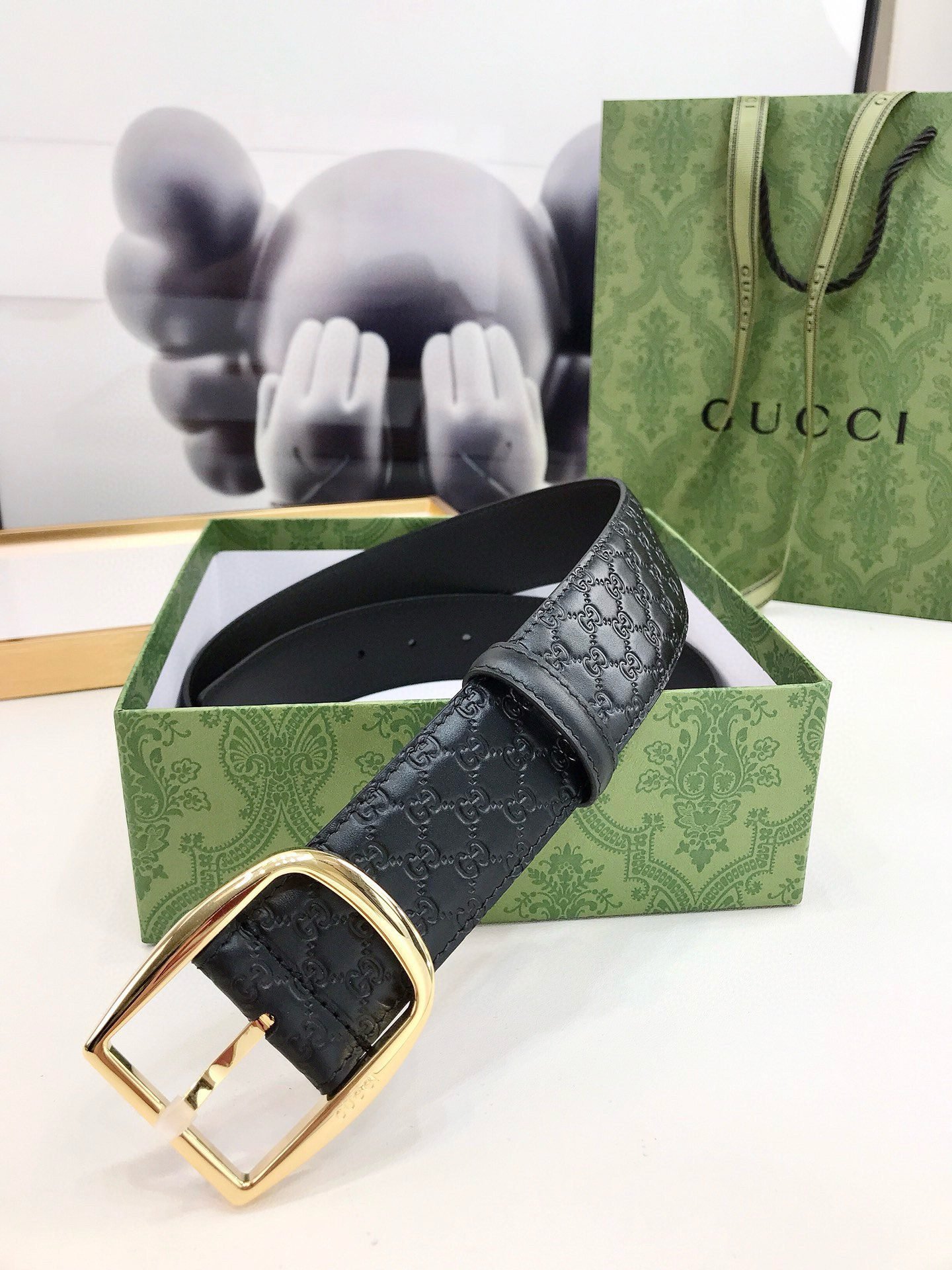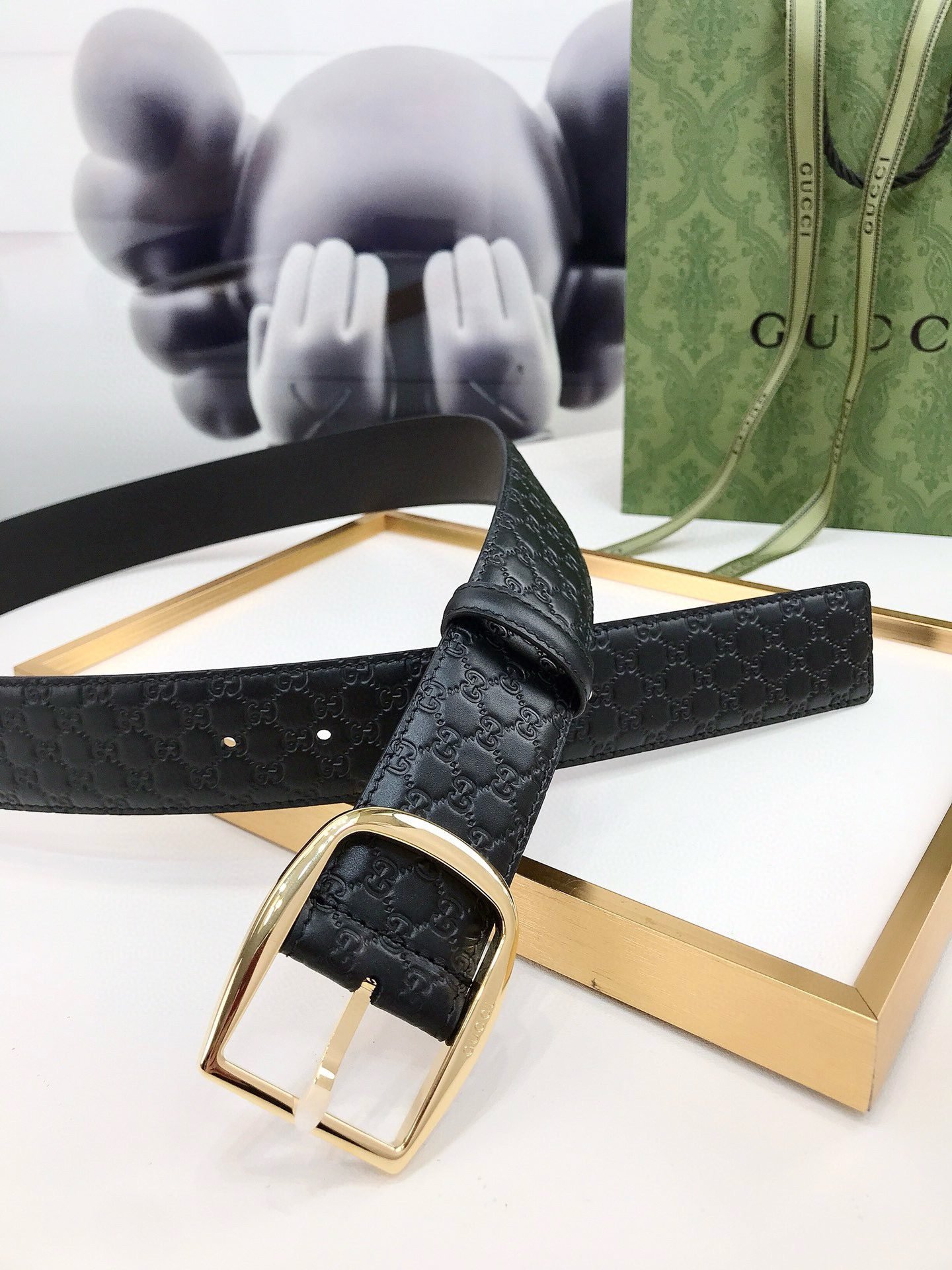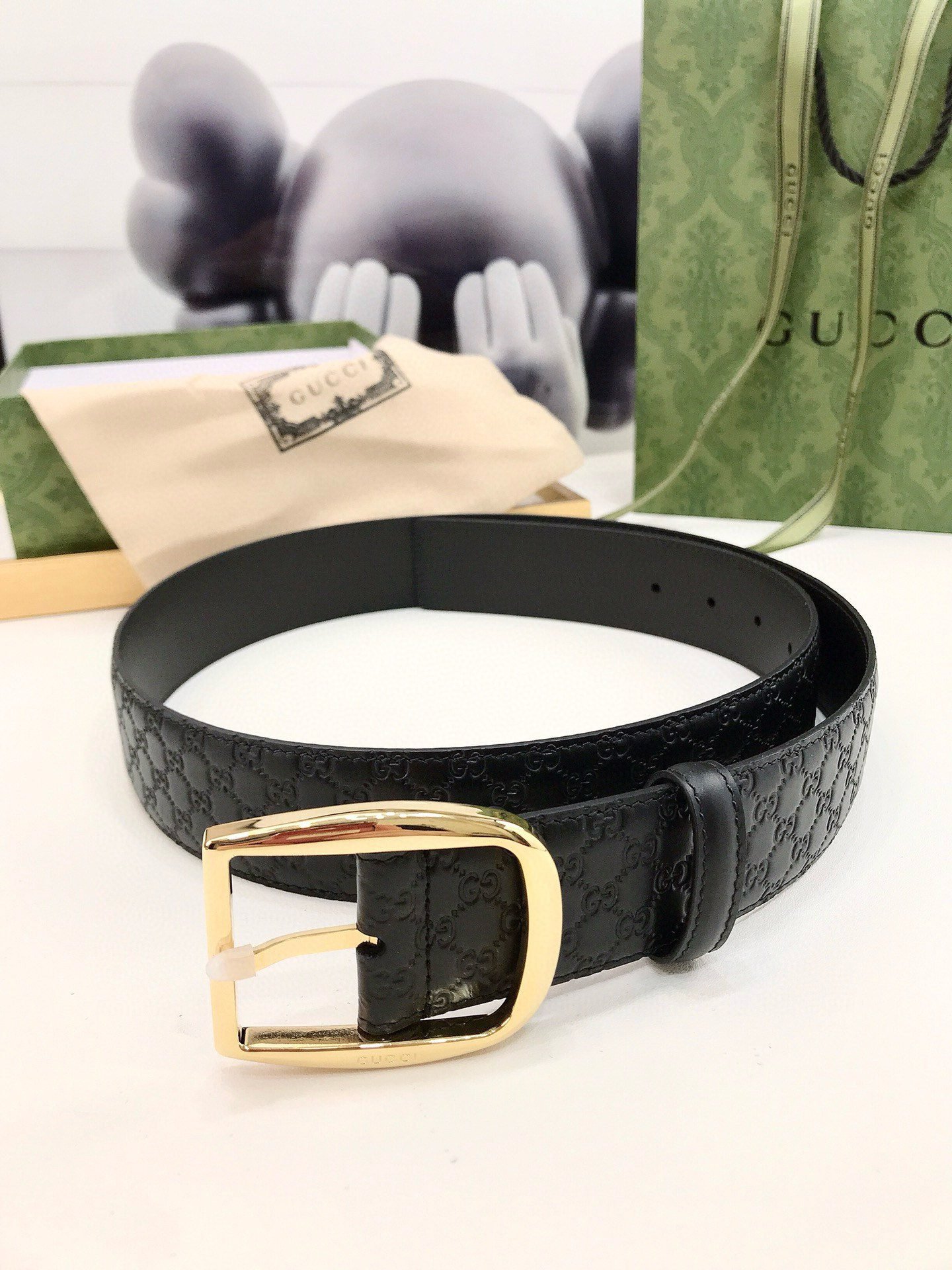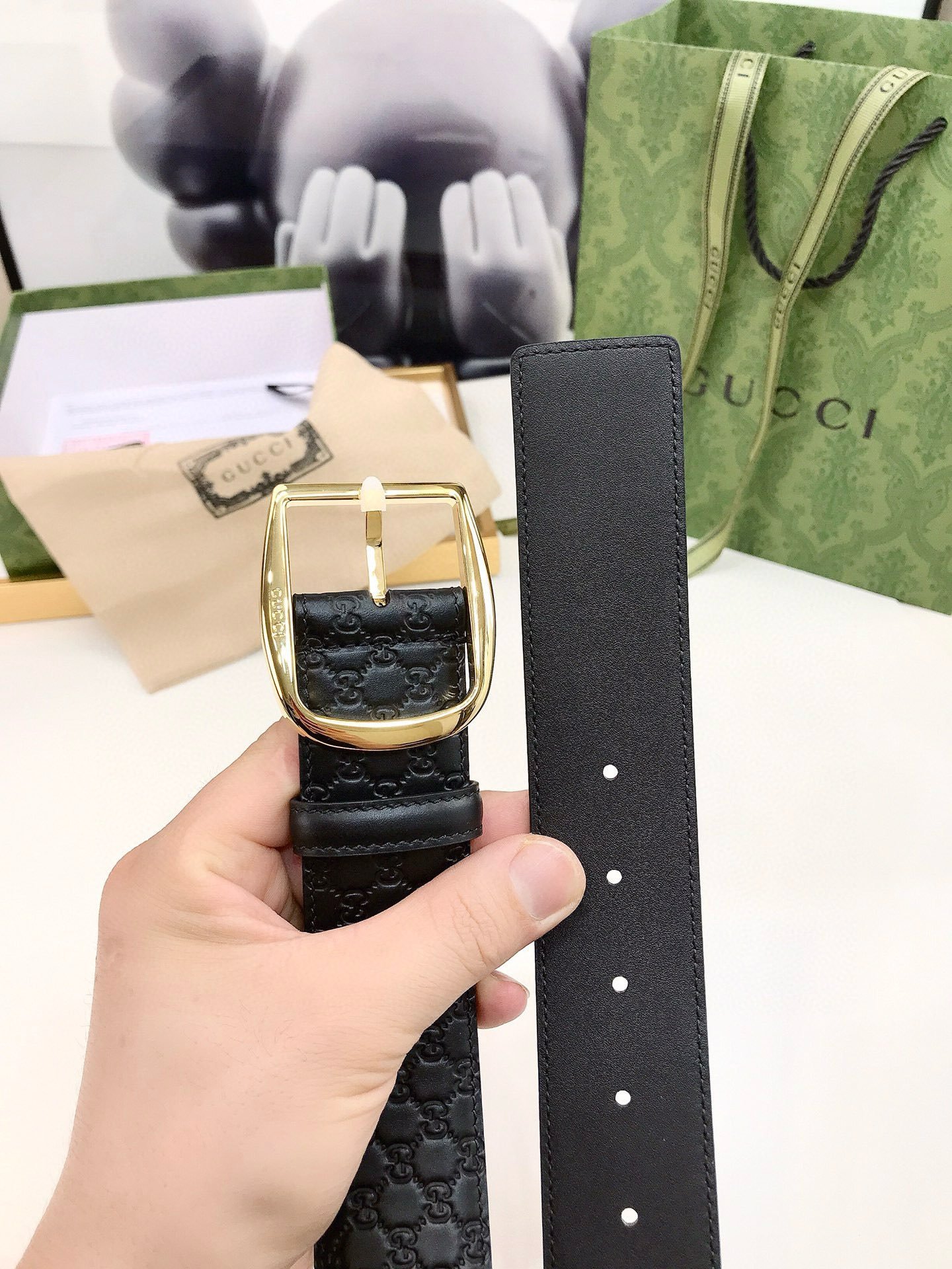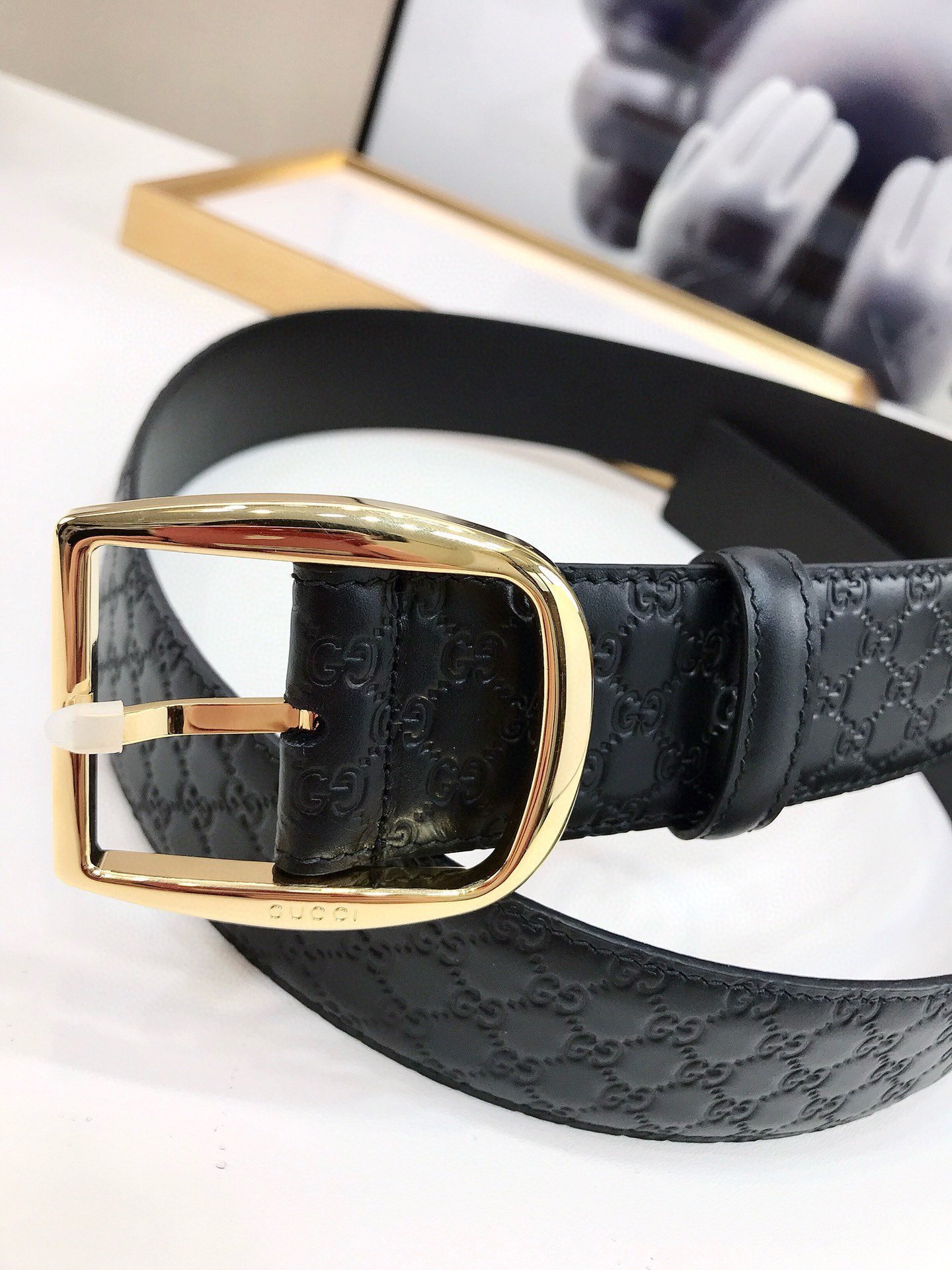 This Gucci black textured belt shows the brand’s consistent elegance and sophistication. The belt is designed in pure black, with a unique luster and delicate texture on the surface, showing an extraordinary texture. The buckle part is designed with a golden metal ring, and the middle perforation is convenient for adjustment, which is both practical and fashionable. In addition, the “GUCCI” logo on the belt further highlights the brand’s nobility and uniqueness.