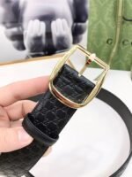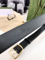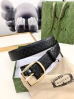 This Gucci black textured belt shows the brand’s consistent elegance and sophistication. The belt is designed in pure black, with a unique luster and delicate texture on the surface, showing an extraordinary texture. The buckle part is designed with a golden metal ring, and the middle perforation is convenient for adjustment, which is both practical and fashionable. In addition, the “GUCCI” logo on the belt further highlights the brand’s nobility and uniqueness.