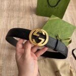 Gucci’s gold double G black textured belt is a combination of the brand’s exquisite craftsmanship and unique design. The belt is made of top-grade genuine leather, which has been finely polished and specially treated to present a smooth and delicate texture, soft and comfortable to the touch. The gold G buckle on the belt is made of high-quality alloy material, with a dazzling luster, forming a sharp contrast with the black leather, highlighting the brand’s nobility and luxury.
