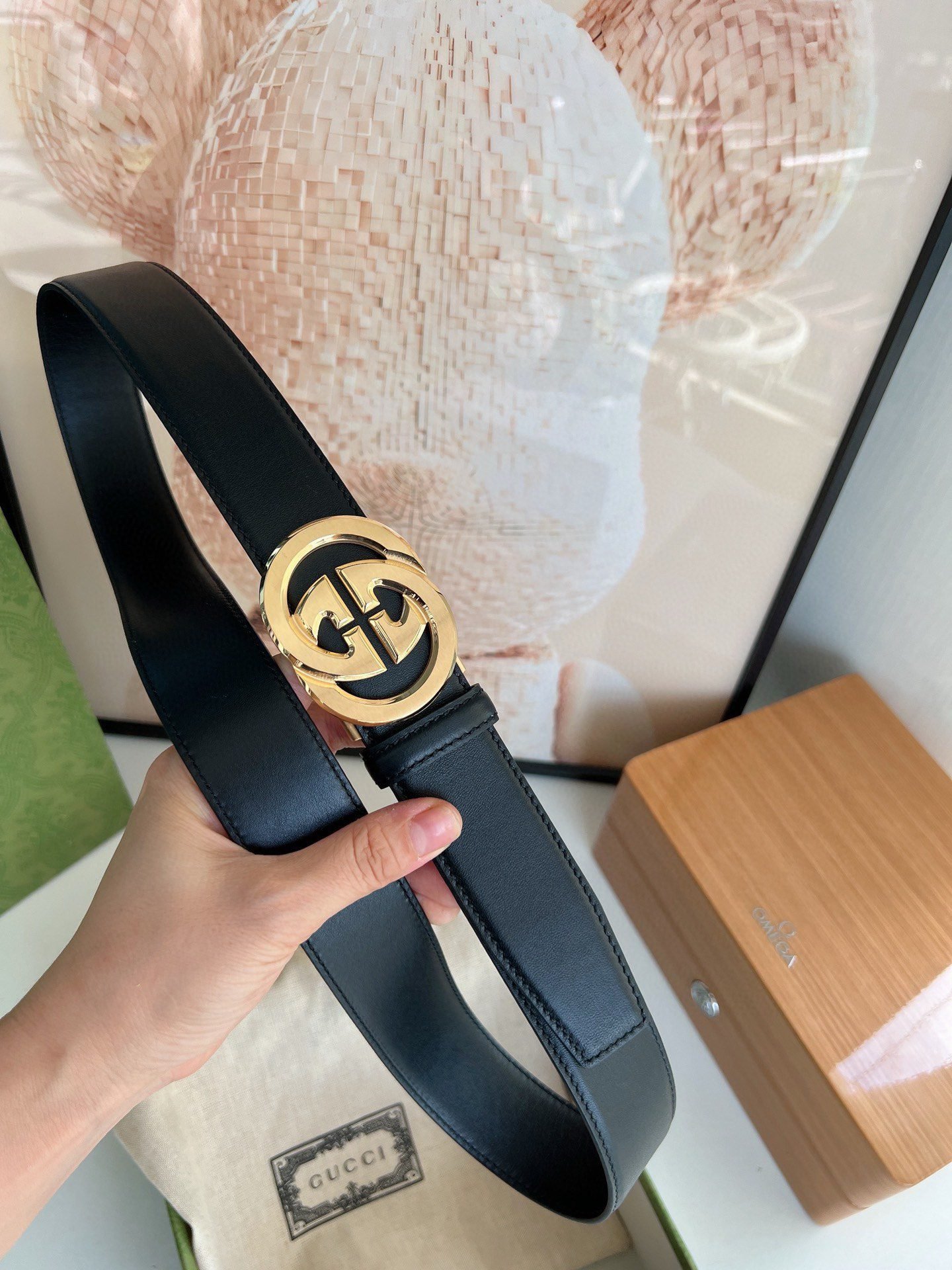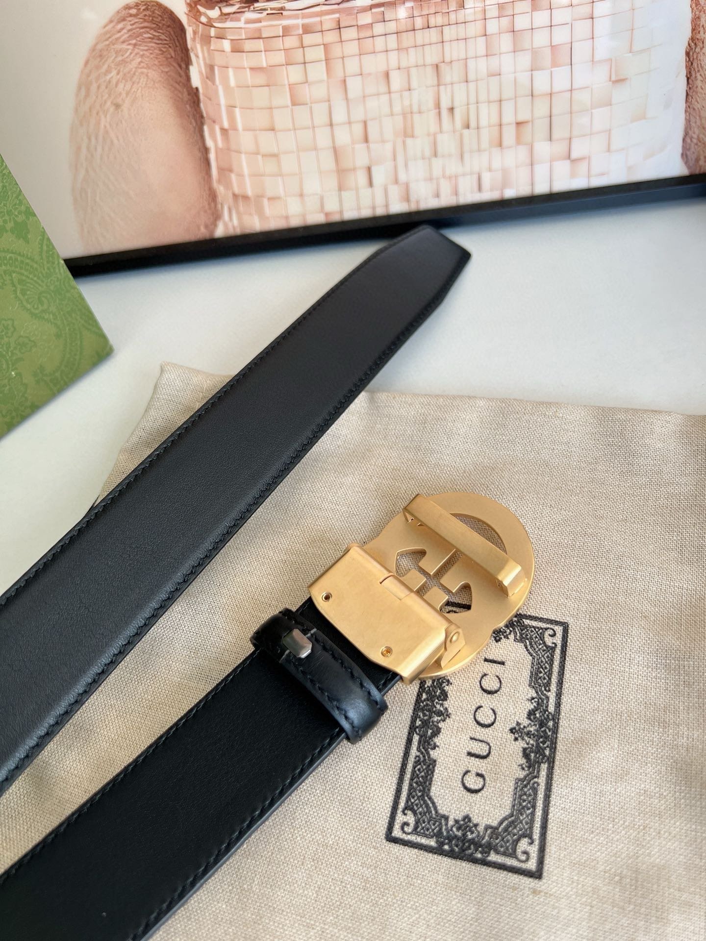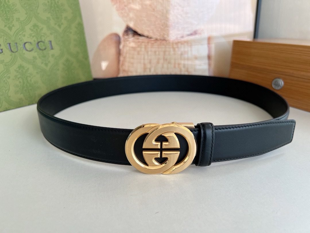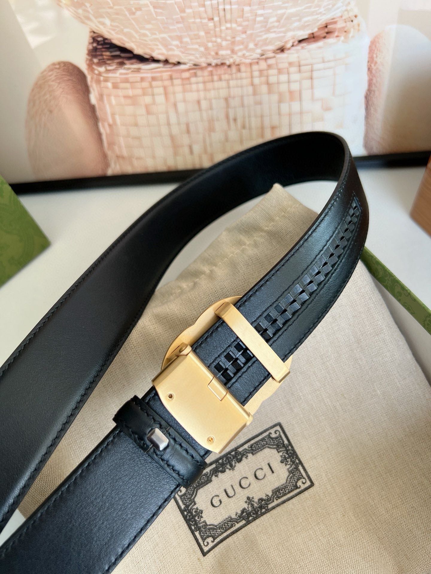 Gucci gold double G buckle black belt, with its unique double G logo buckle and pure black belt, highlights the elegance and nobility of the brand. The belt is made of top-quality leather, which is soft and delicate to the touch, wear-resistant and durable, and can maintain a new appearance for a long time. The double G buckle is made of high-quality metal, with bright luster, exquisiteness and elegance, highlighting the wearer’s unique taste.