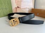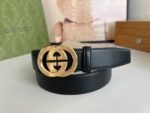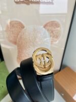 Gucci gold double G buckle black belt, with its unique double G logo buckle and pure black belt, highlights the elegance and nobility of the brand. The belt is made of top-quality leather, which is soft and delicate to the touch, wear-resistant and durable, and can maintain a new appearance for a long time. The double G buckle is made of high-quality metal, with bright luster, exquisiteness and elegance, highlighting the wearer’s unique taste.
