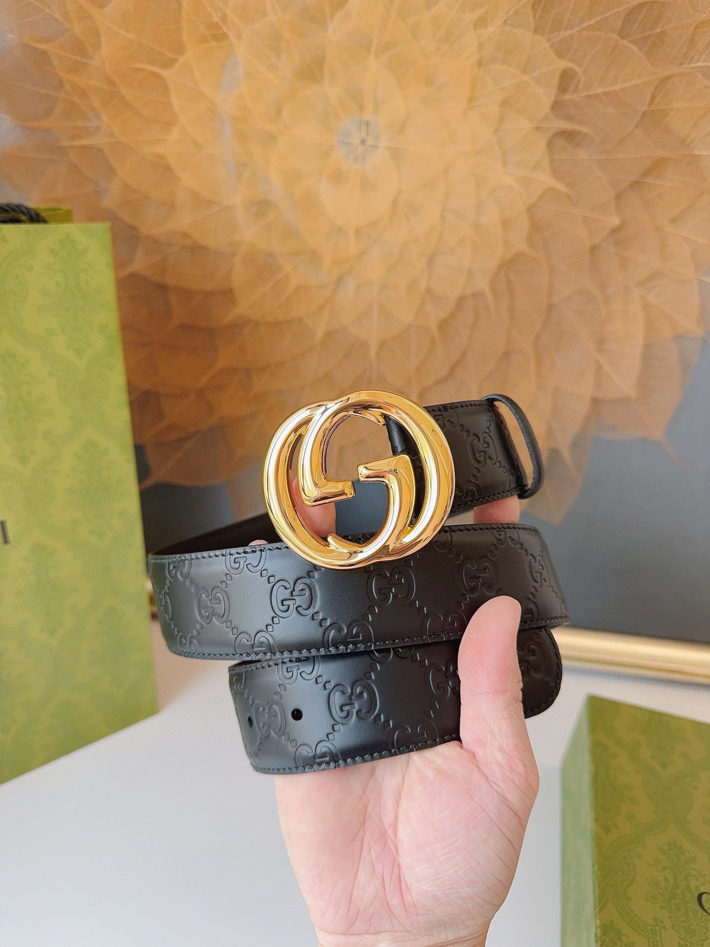This belt, with its unique golden double G logo and elegant black design, shows its extraordinary quality. This belt is made of the finest leather material, feels delicate and smooth, and has excellent durability and toughness. The golden G logo is made of finely carved metal and shines with a unique light, whether from a distance or close range, showing the brand’s unique charm and high-end temperament.